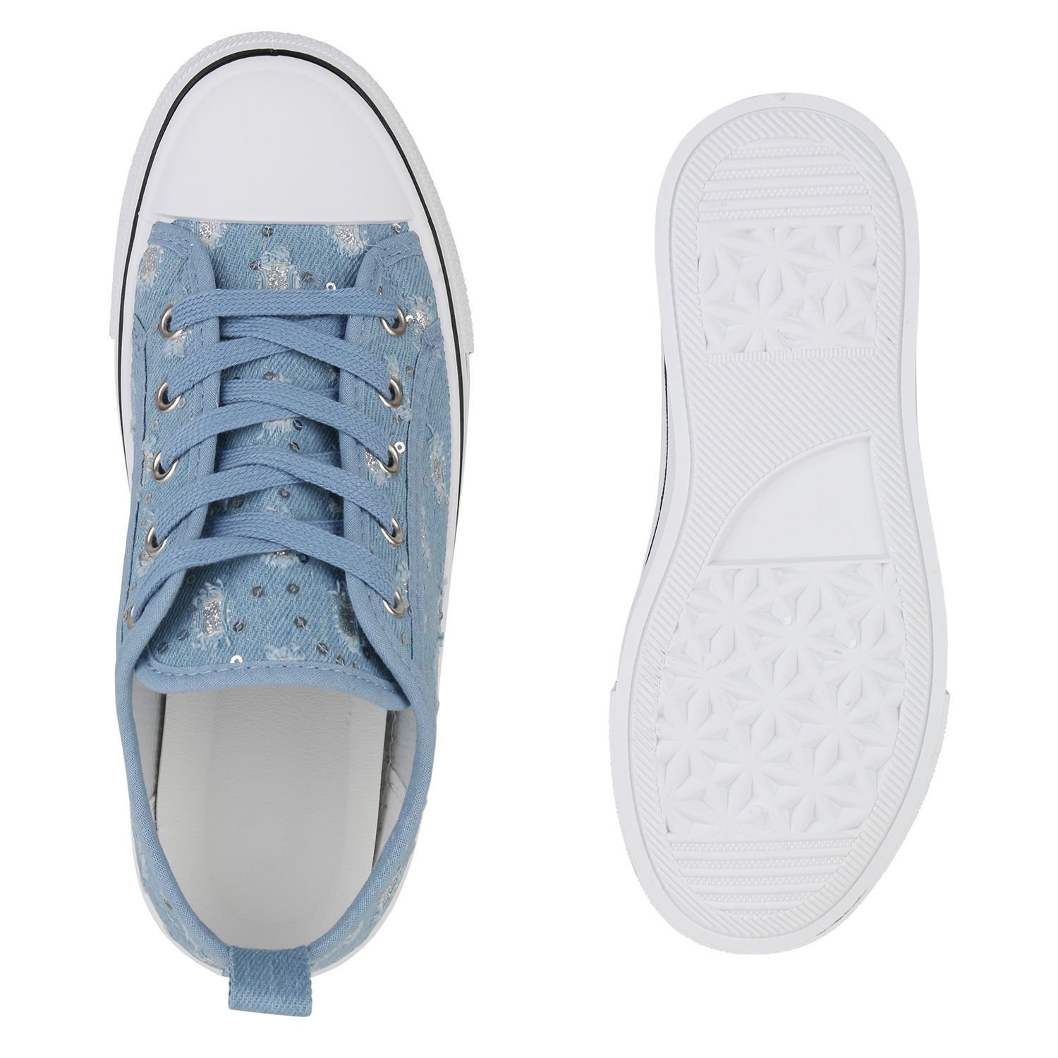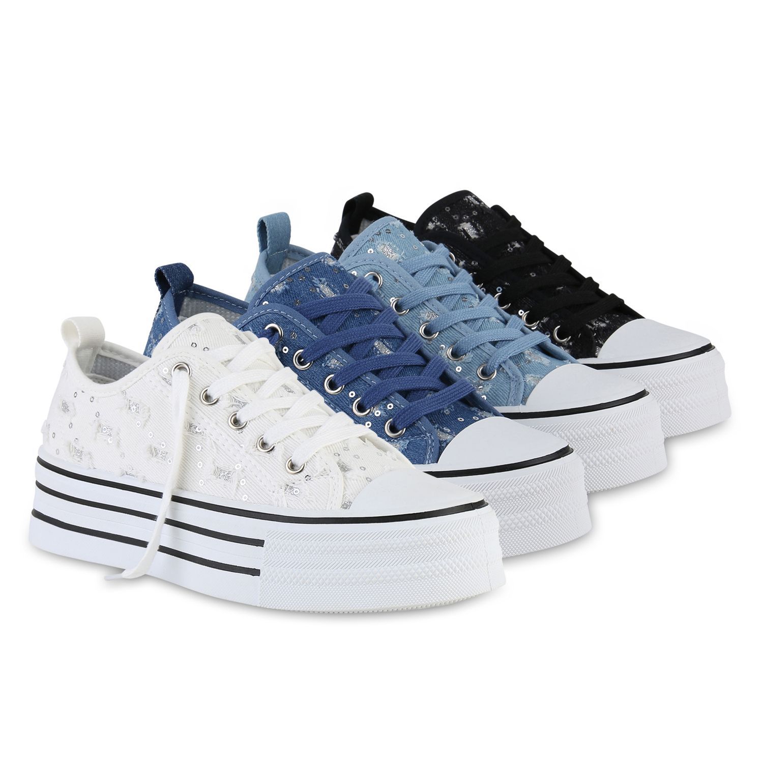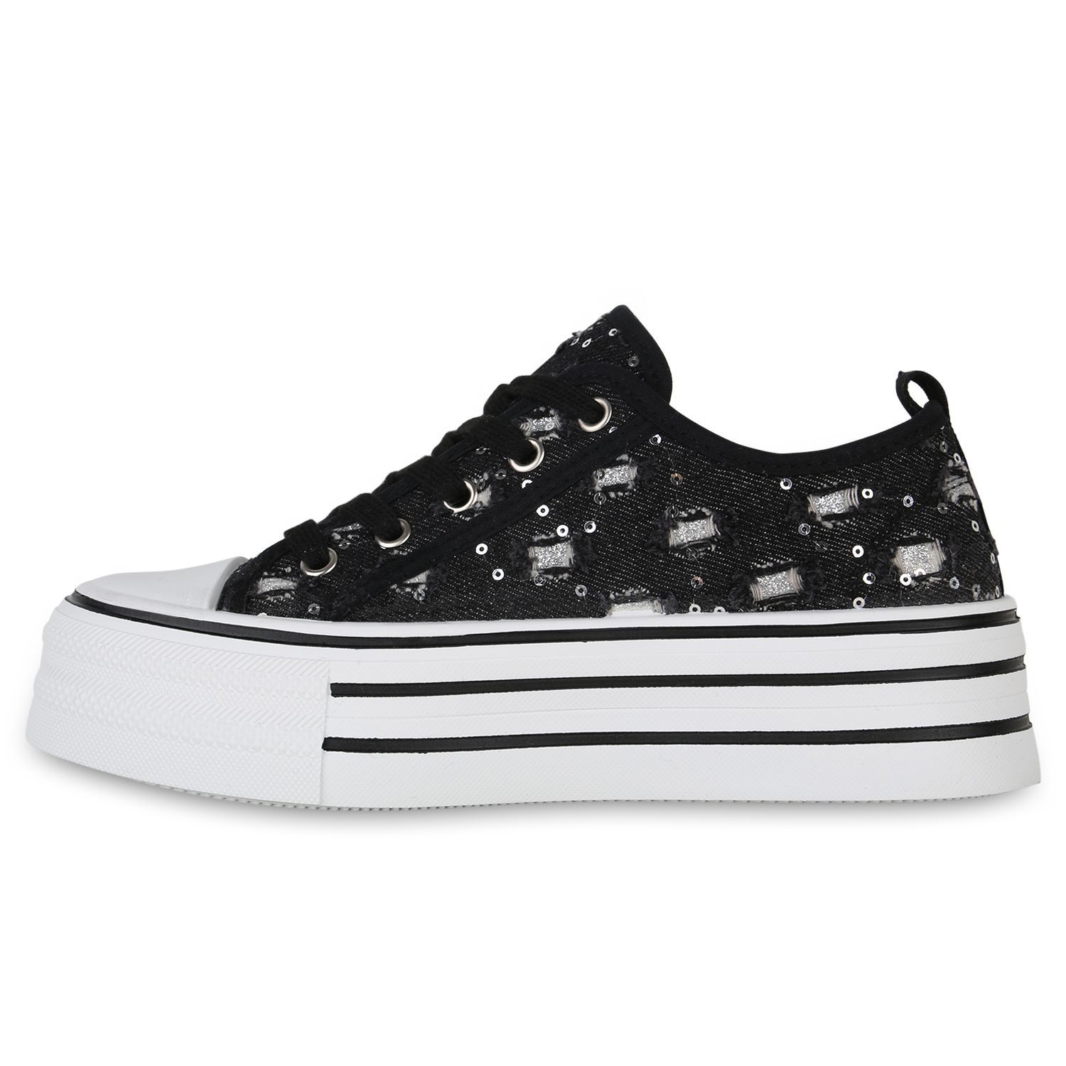 VAN HILL Damen Plateau Sneaker Denim Schnürer Pailletten Glitzer Schuhe 840981