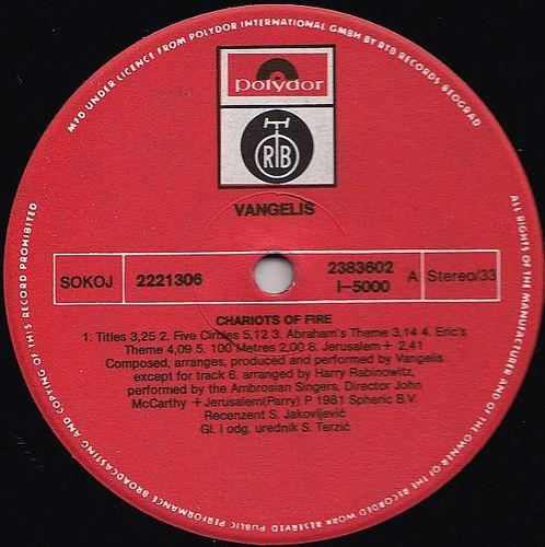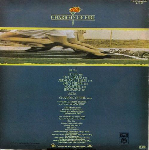Vangelis – Chariots Of Fire 2383 602 Titel-Verzeichnis : A1 Vangelis– Titles 3:25 A2 Vangelis– Five Circles 5:12 A3 Vangelis– Abraham's Theme 3:14 A4 Vangelis– Eric's Theme 4:09 A5 Vangelis– 100 Metres 2:03 A6 The Ambrosian Singers– Jerusalem 2:41 B Vangelis