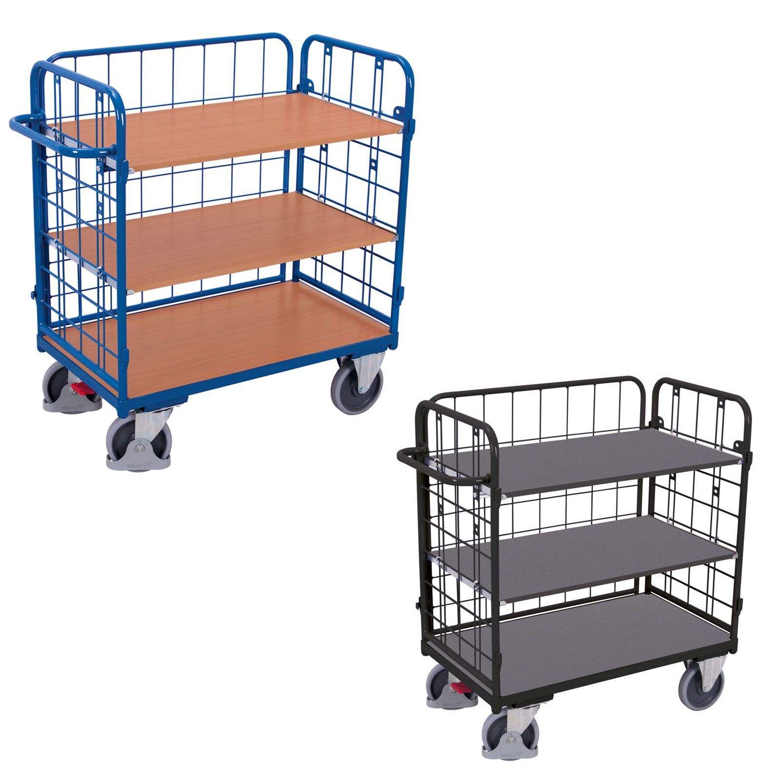 VARIOfit Dreiwandwagen, niedrig und vergittert mit 3 Etagen 850x500mm Enzianblau RAL