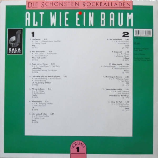 Various - Alt wie ein Baum - Die schönsten Rockballaden Volume 1 LP Vinyl 1 LP VÖ: 1991 Label: Deutsche Schallplatten Berlin Vinyl: VG+ Cover: VG+ (Barcode Coverrücken, beschädigt) Seite 1: „Am Fenster“ City (1977), „Wer die Rose ehrt“ Klaus Renft Combo (1972); „Sagte mal ein Dichter“ Holger Biege (