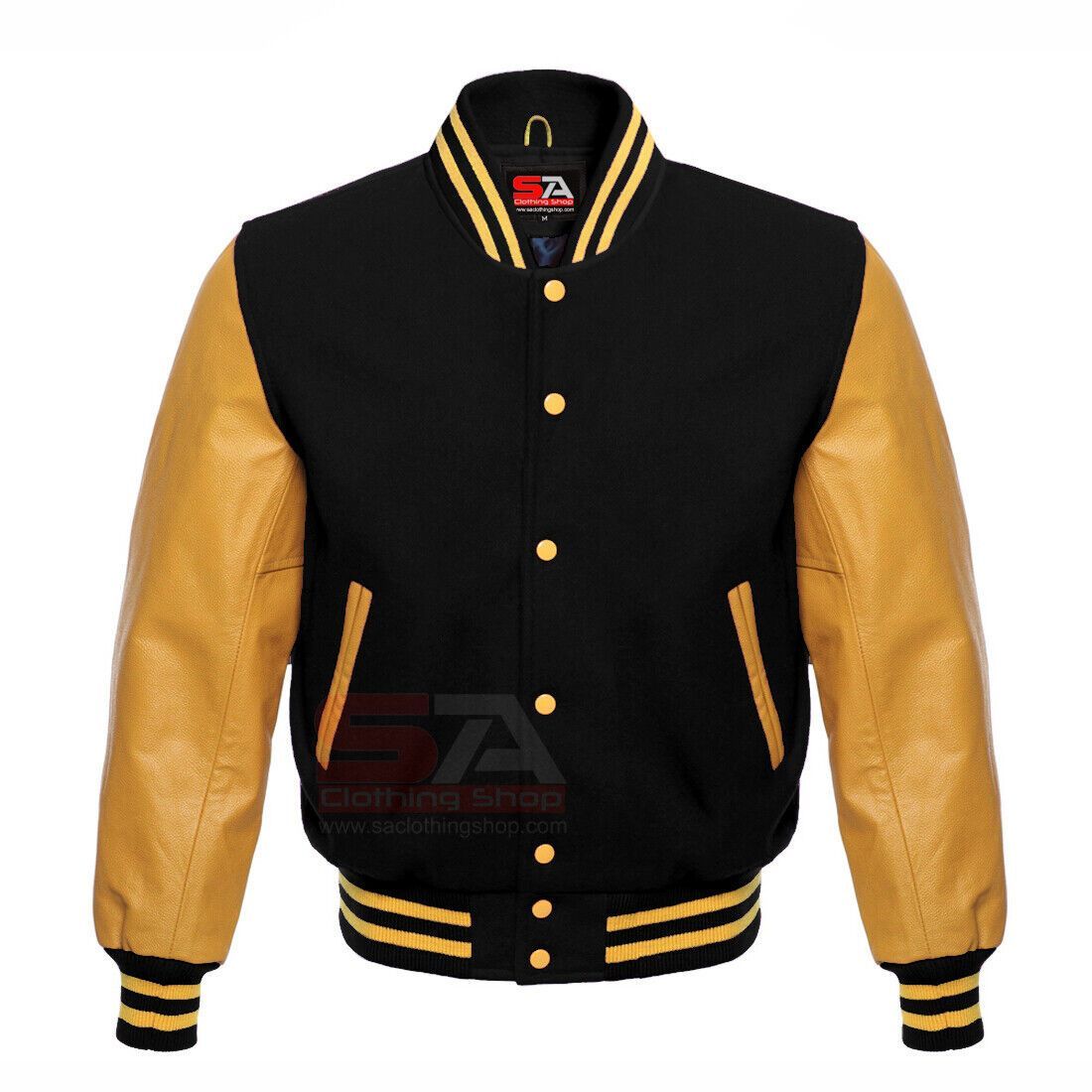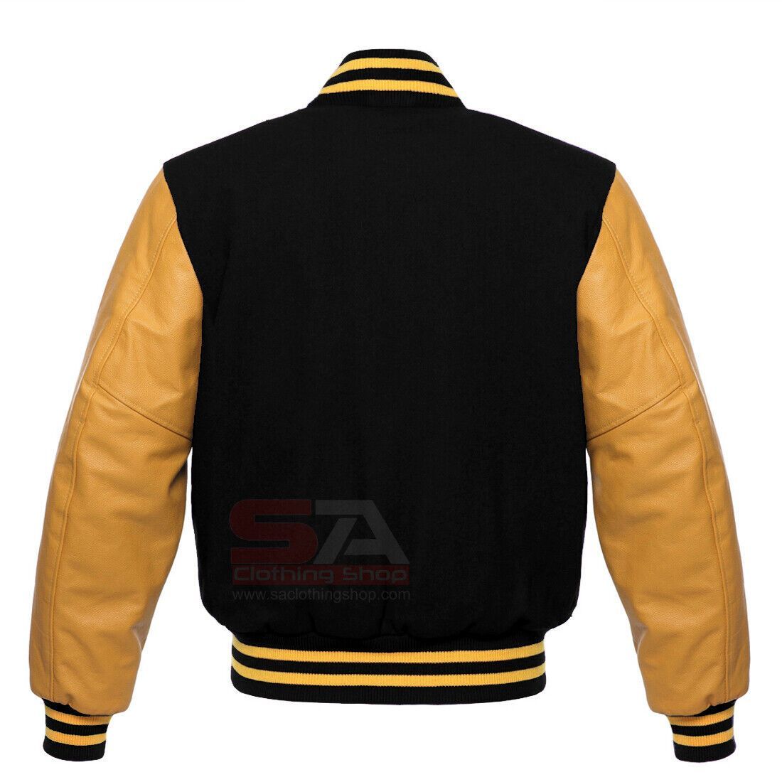 Varsity Men´s Letterman Baseball Black Wool Genuine Gold Leather Sleeves Jacket