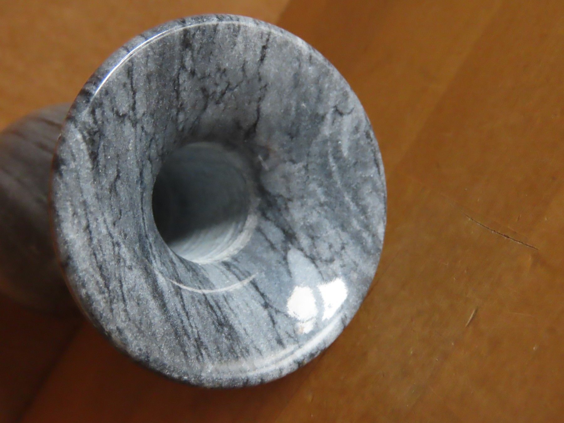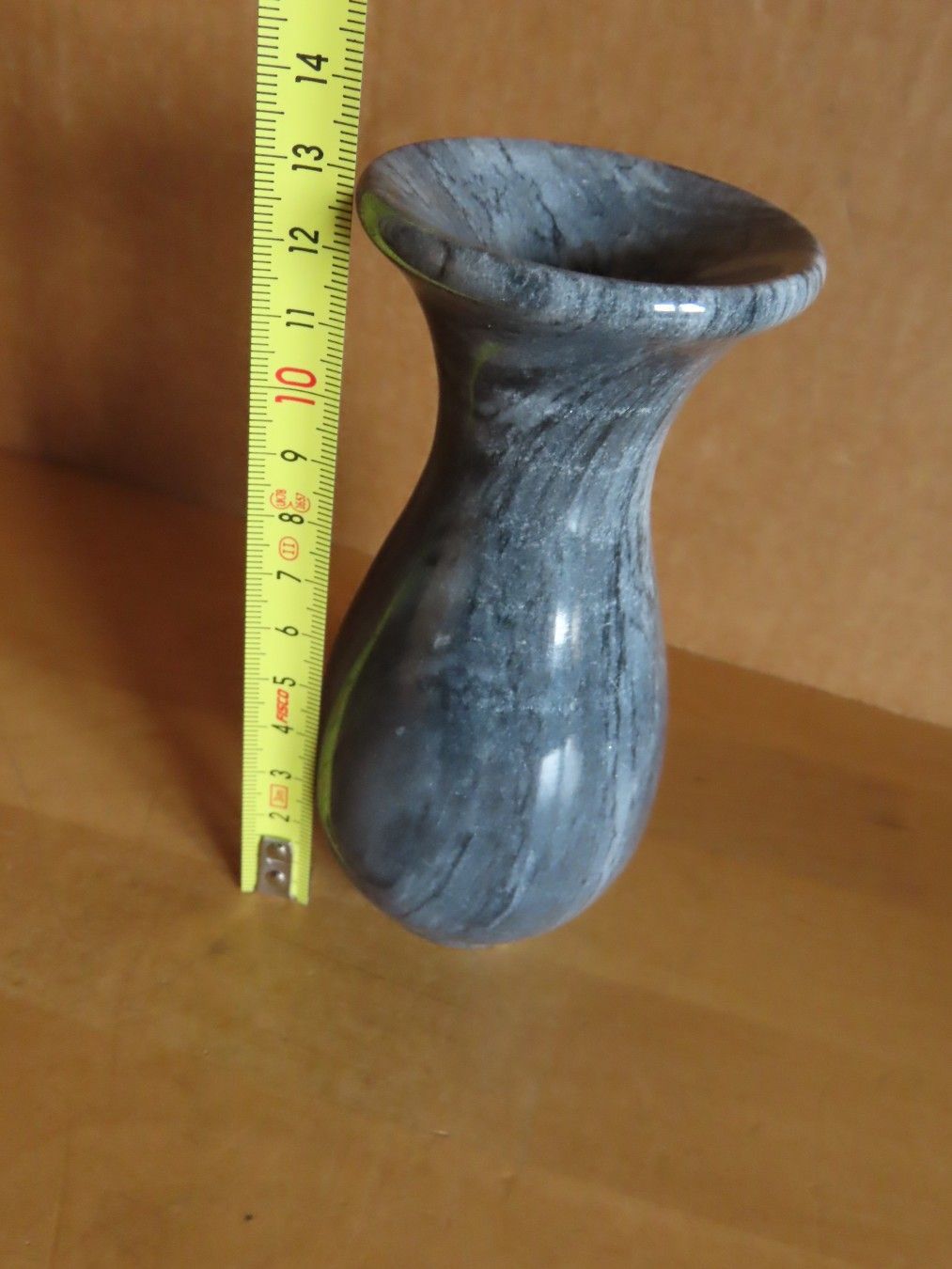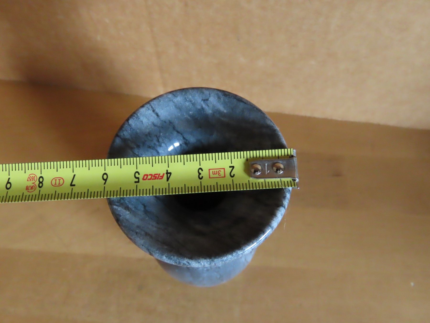 Maße: ca. 6 cm Durchmesser x ca. 13 cm hoch-- die Öffnung hat einen Durchmesser von ca. 2 cm, innen ca. 8 cm hoch Material: Stein Alabaster bin aber nicht sicher ist leicht verschmutzt verstaubt Made in Taiwan