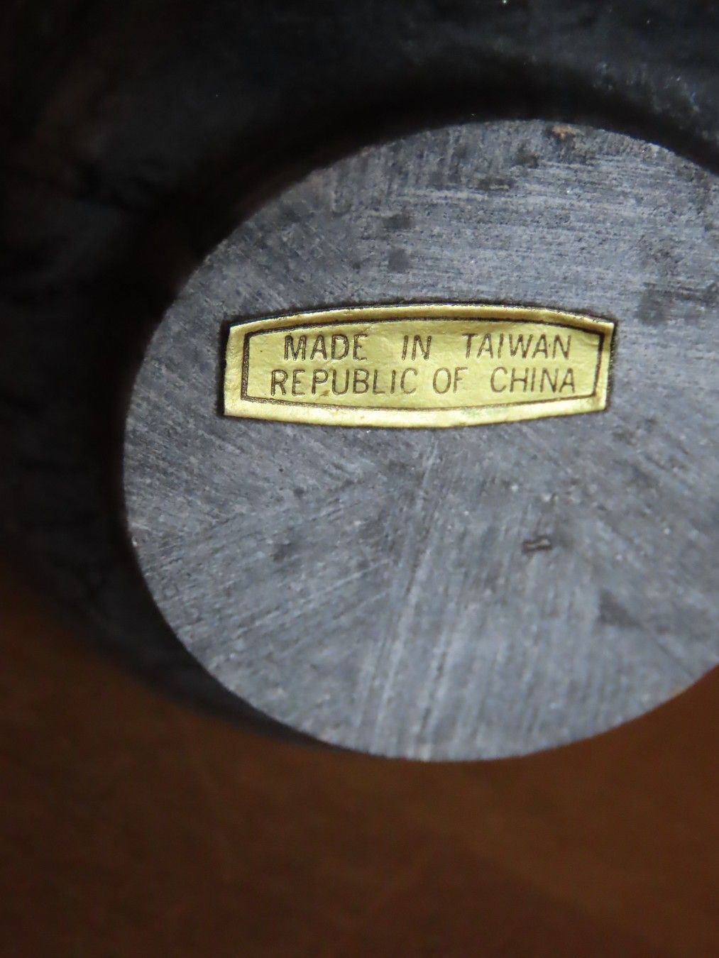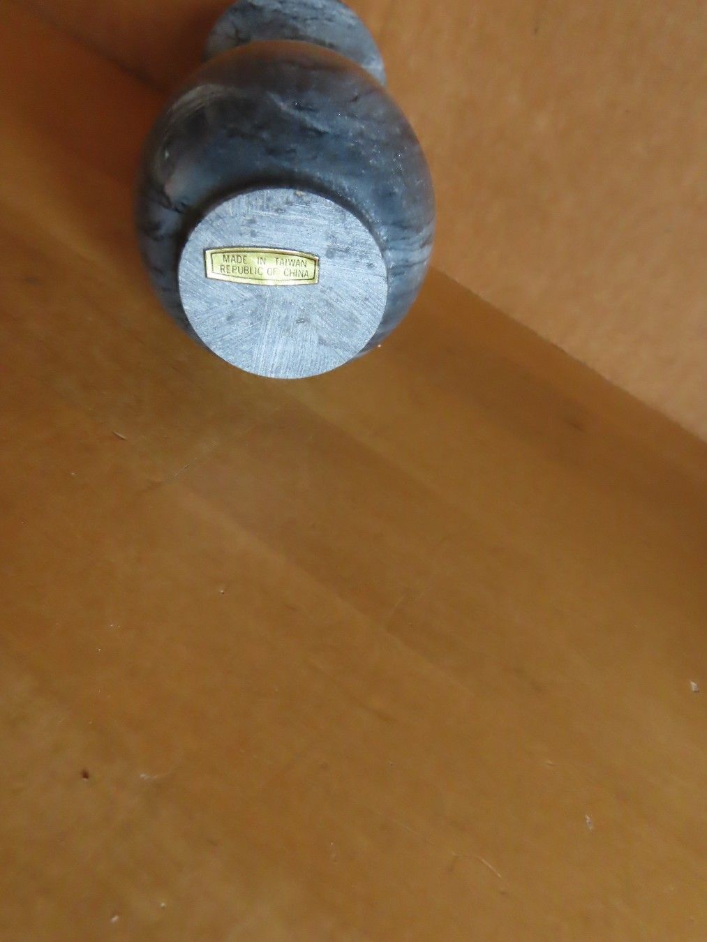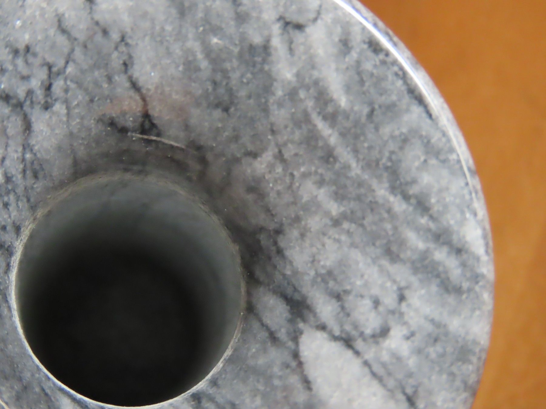 Maße: ca. 6 cm Durchmesser x ca. 13 cm hoch-- die Öffnung hat einen Durchmesser von ca. 2 cm, innen ca. 8 cm hoch Material: Stein Alabaster bin aber nicht sicher ist leicht verschmutzt verstaubt Made in Taiwan