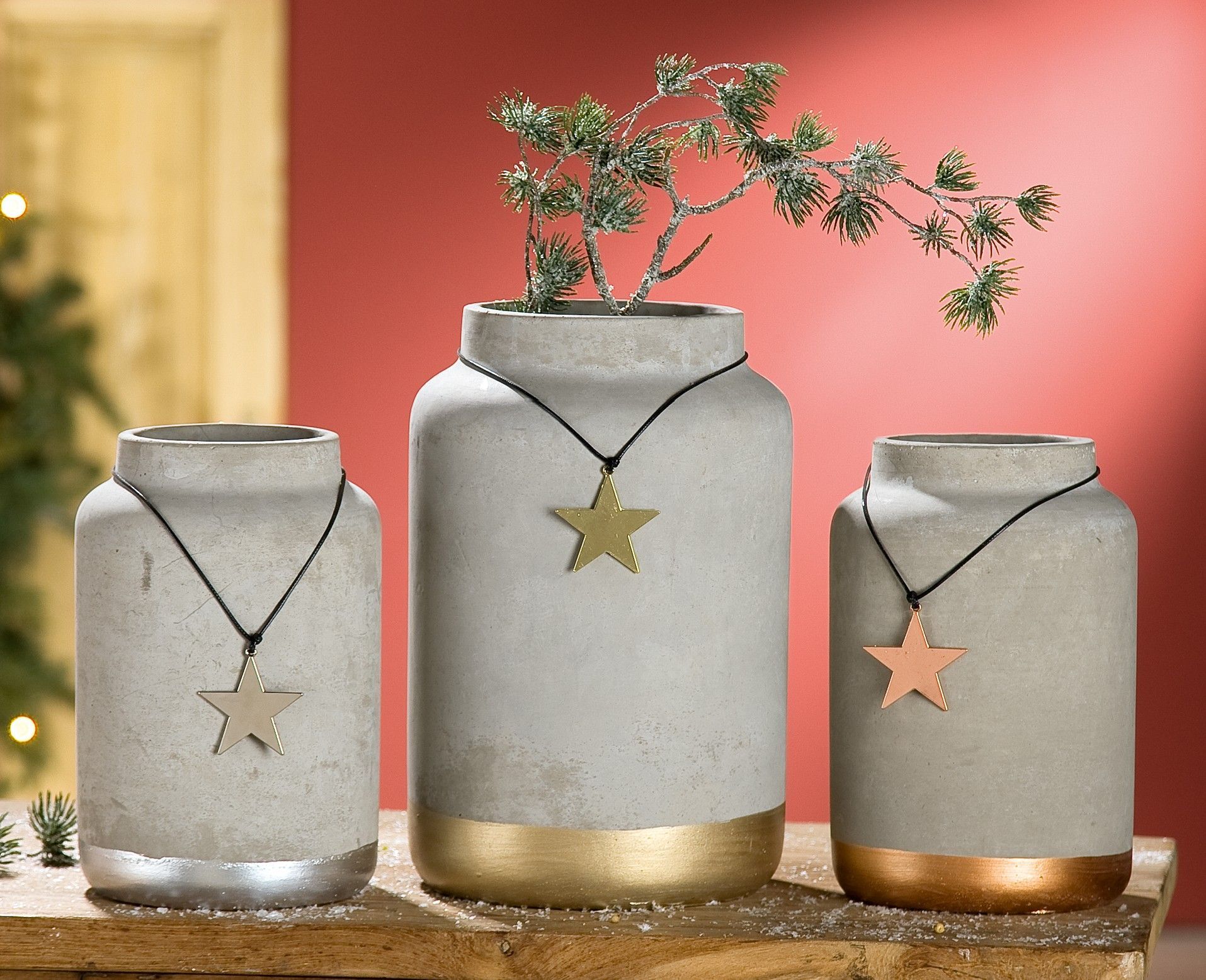 Gilde Vase Blumenvasem Zement Halsvasem mit Metallstern 3er Set - Gilde