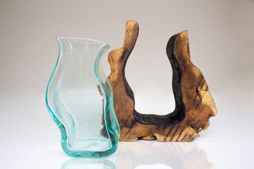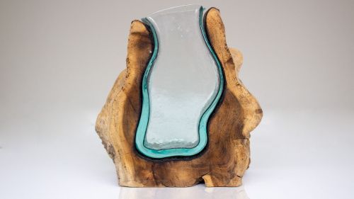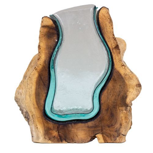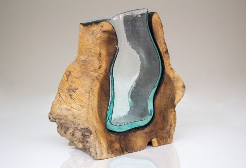 Vase im Holz" Mundgeblasenes Glas auf Wurzelholz - LxBxH 22 x 8 x 22 cm