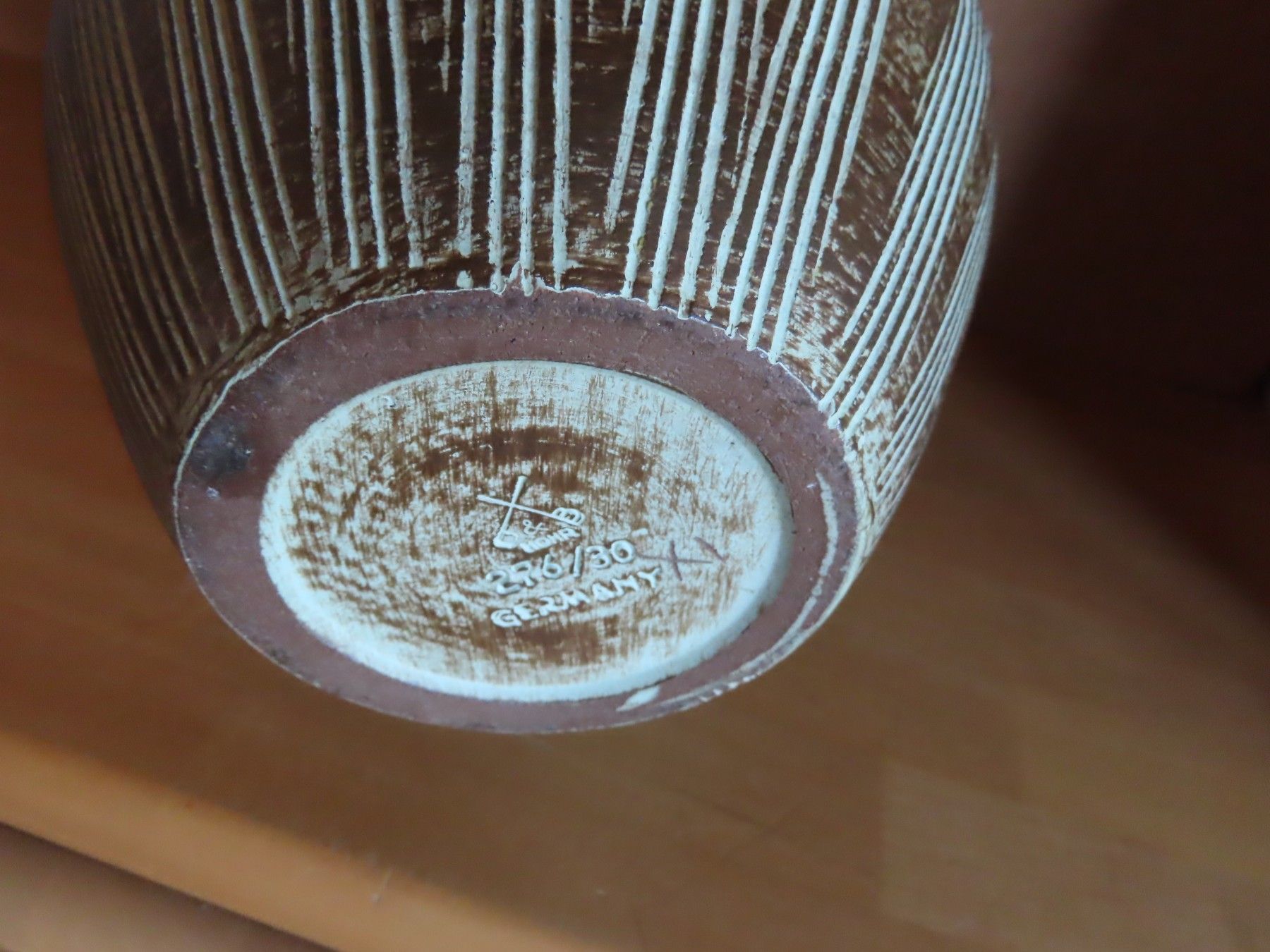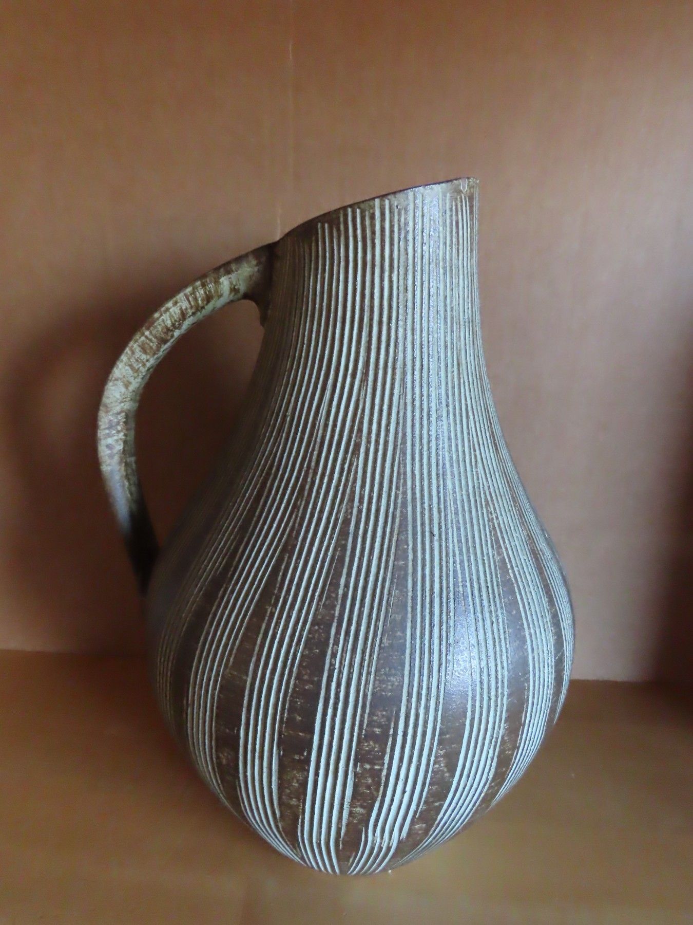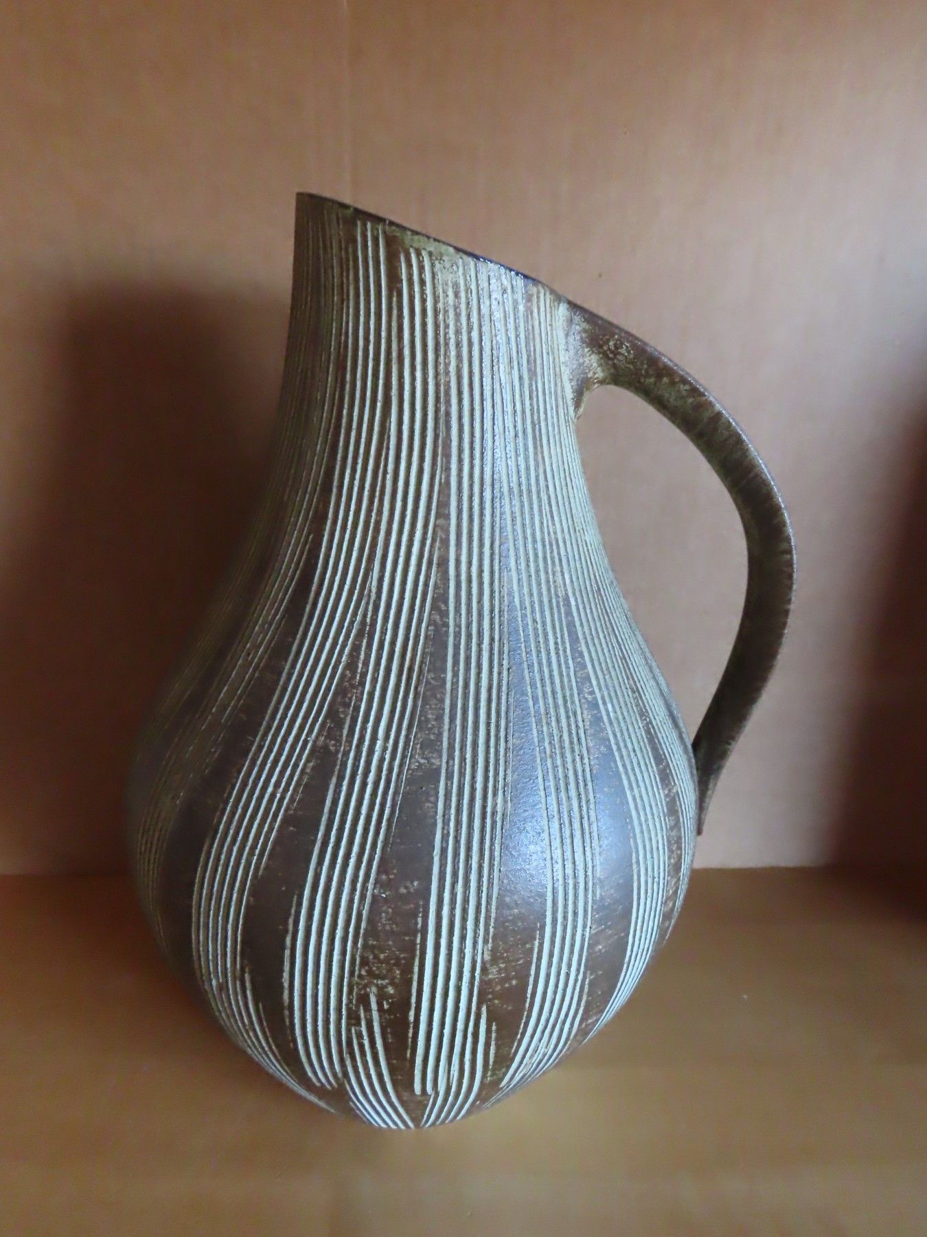 Maße: ca. 29 cm hoch und hat einen Durchmesser von ca. 19 cm ---immer an der breiteten Stelle gemessen aber ohne Griff die Öffnung hat einen Durchmesser von ca.6,5 cm und der Boden hat einen Durchmesser von ca. 9 cm Material: Keramik ist innen verschmutzt und hat zwei kleine Absplitterung... Mehr