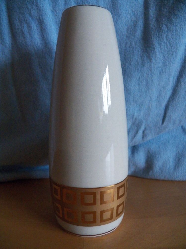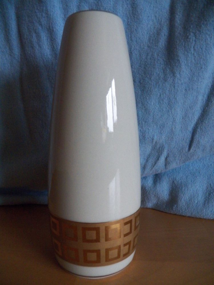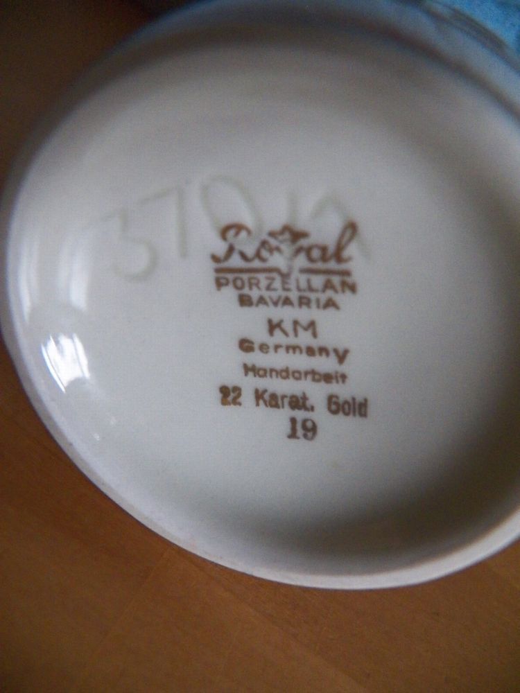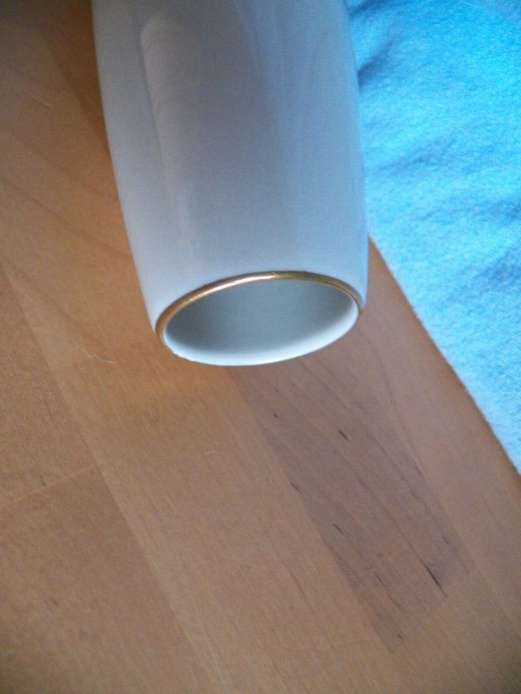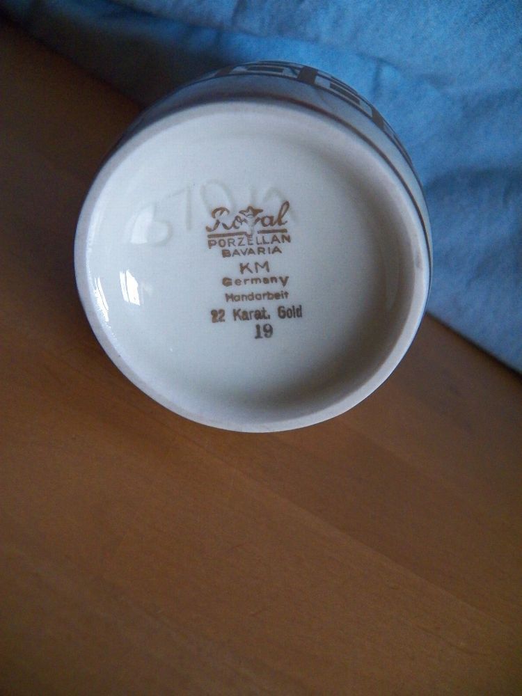 19 --370 1--Porzellan - Teil könnte verstaubt oder verschmutzt sein Höhe ca. 18 cm hoch Durchmesser ca. 6,5 cm immer die breiteste Stelle gemessen Öffnung für die Blumen hat ca. 3,5 cm Durchmesser Boden innen hat ca. 6 cm Durchschitt Auf der Unterseite steht : Rayal Porzellan Bavaria KM Handarbeit 2