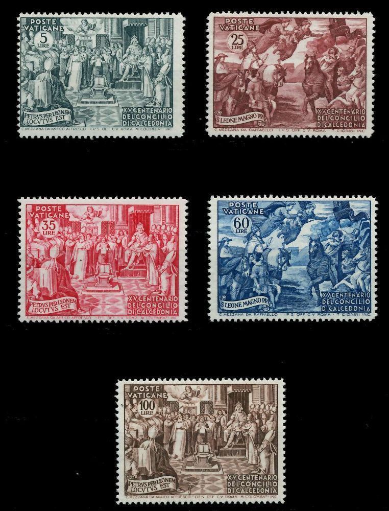 VATIKAN 1951 Nr 180-184 postfrisch 1500. Jahrestag des Konzils von Chalkedon 39.97€ incl. MwSt: Differenzbesteuert zzgl. Versandkosten Bestell-Nr.: 7C4A32 Katalog-Nr: MICHEL (180 - 184) Katalogpreis: 100 EUR Qualität: Normal Erhaltung: Postfrisch ** Einheit: Satz Bogenlage: Gummierung: Geprüft: