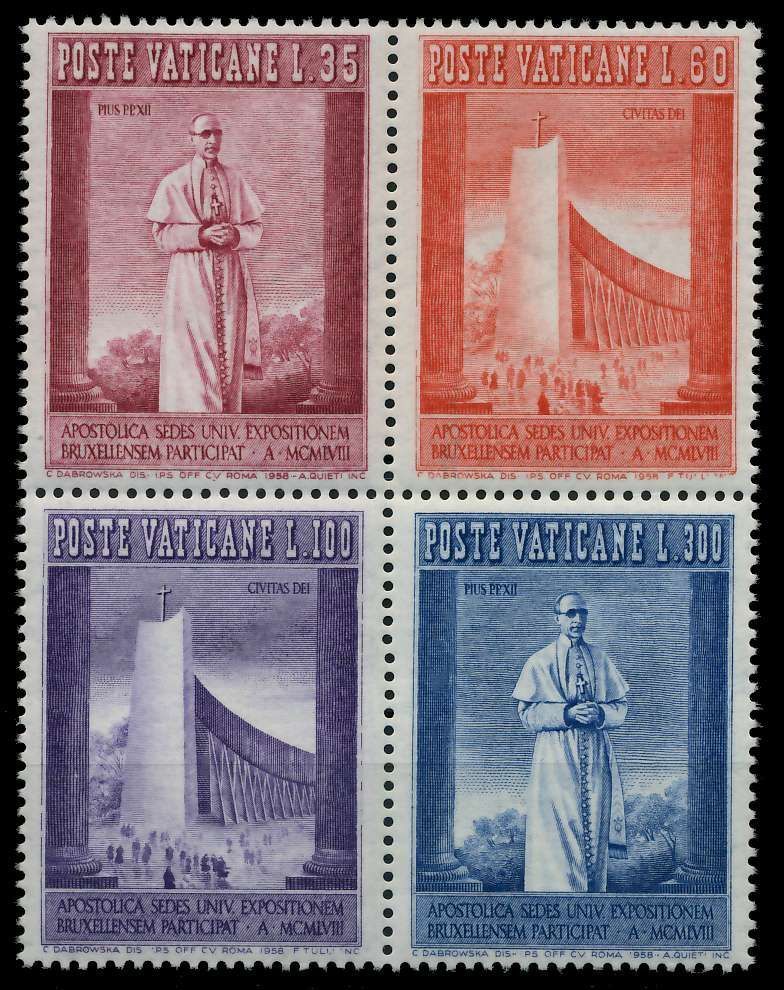 VATIKAN 1958 Nr 292-294 postfrisch VIERERBLOCK Einzelmarken im 4er Block aus der Blockausgabe zur Weltausstellung in Brüssel 10.81€ incl. MwSt: Differenzbesteuert zzgl. Versandkosten Bestell-Nr.: 7C4C36 Katalog-Nr: MICHEL (292 - 294) Katalogpreis: 20 EUR Qualität: Normal Erhaltung: Postfrisch *