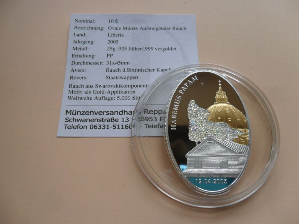 Aufsteigender Rauch Habemus Papam 2005 Ovale - Silber Münze 10 $ Liberia in PP 25g - 925 Silber .999 vergoldet - 31 x 45 mm - Auflage 5000 Rauch aus Swarovskikomponenten Motive als Gold-Applikation. Münze wird wie im Bild geliefert - in org.Münzkapsel und Reppa Zertifikat Schauen Sie auch meine ande