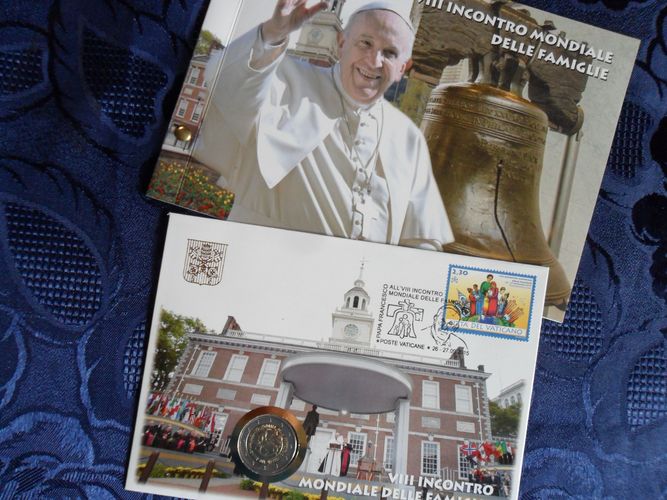 VATIKAN 2015 2 € Weltfamilientag in Philadelphia als Numisbrief im Folder wie vom Vatikan ausgegeben mit Vatikan Briefmarken im Vatikan abgestempelt