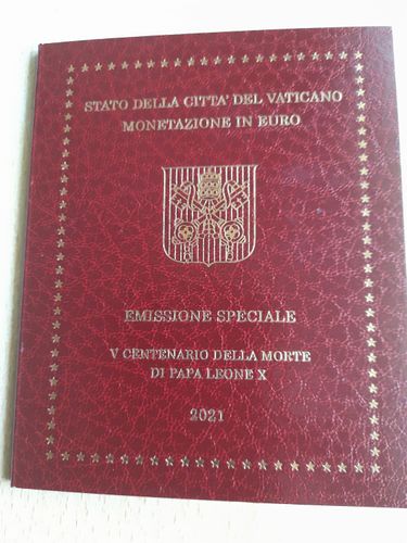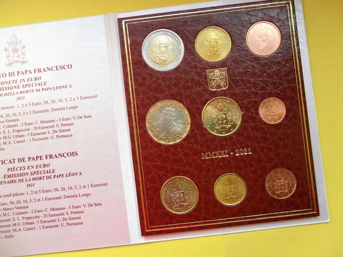 VATIKAN 2021 mit 5 € Sondermünze 500.Todestag von Papst Leo X. 2021 wurden vom Vatikan zwei Münzsätze herausgegeben 1x Münzsatz 1C - 2 € und 1 x Sonder - Münzsatz mit 9 Münzen 1C - 5 € es sind beide Sätze eingestellt 8. Münzsatz von Papst Franziskus wie vom Vatikan verausgabt !!