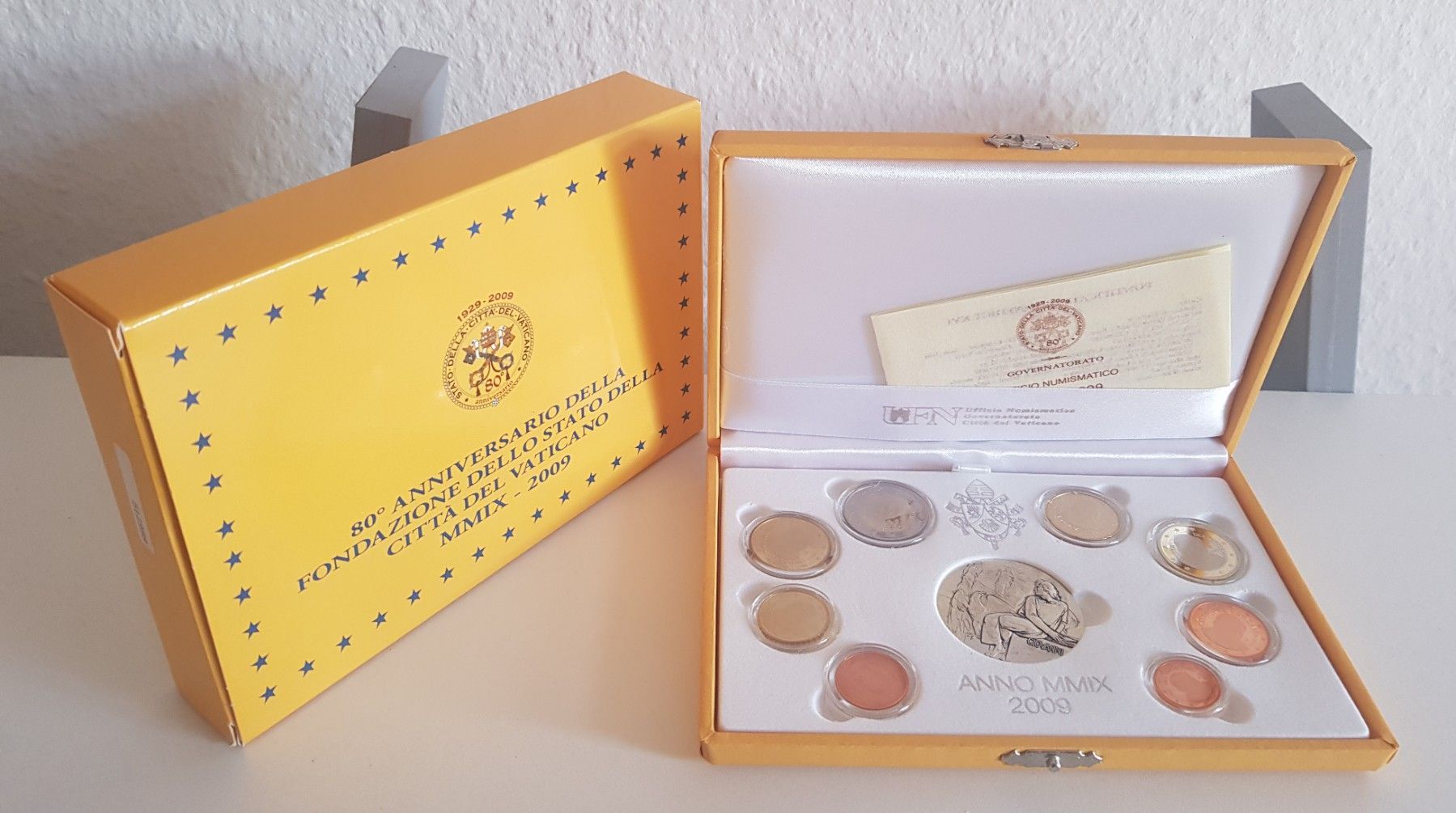 Sie erwerben einen vatikanischen Kursmünzsatz Premium aus dem Jahr 2009 in polierter Platte Die schwere Silbermünze zeigt auf der Vorderseite den Evangelisten Johannes. Auf der Rückseite sehen wir das Wappen von Papst Benedikt Der Evangelist Johannes Der Evangelist Johannes, ist der Hauptautor des J