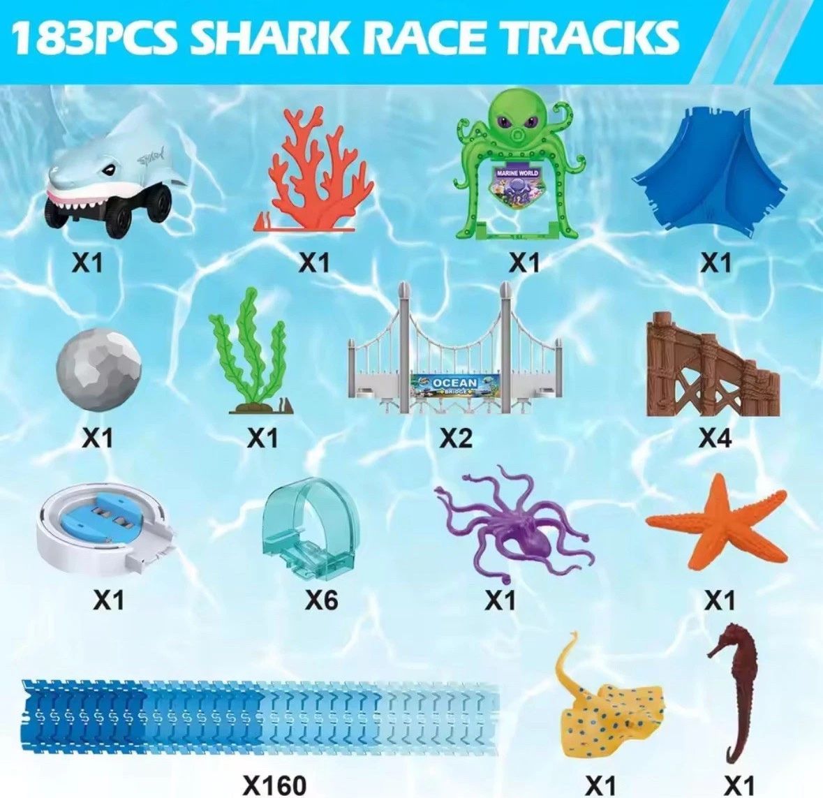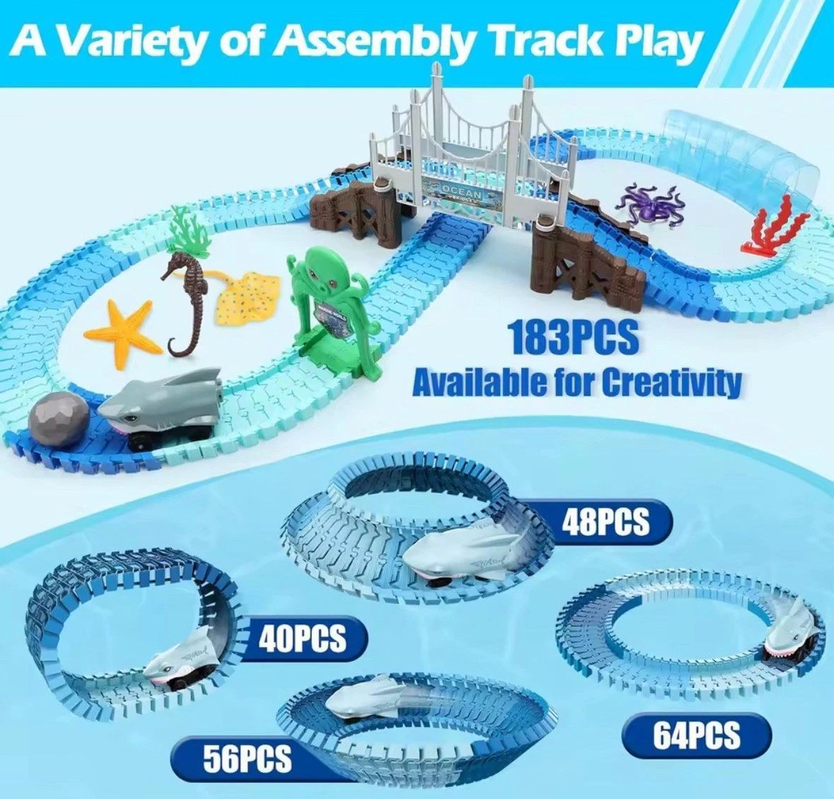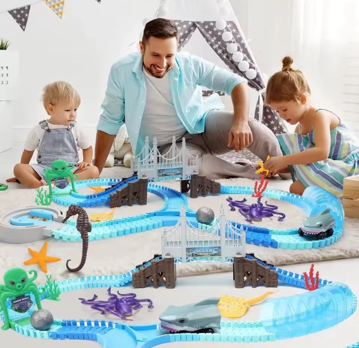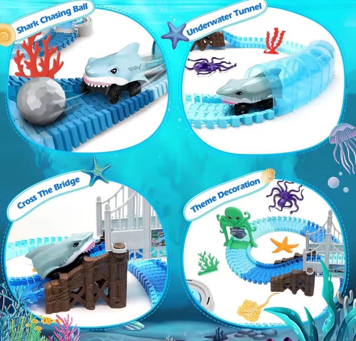 Das VATOS MiniEuroRennstreckenEuroSet Hai-Rennbahn verbindet das Thema Unterwasserwelt mit spannenden Autorennen. Die flexiblen Streckenelemente lassen sich in Kurven biegen, wodurch sich verschiedenste Streckenlayouts bauen lassen. So entsteht ein kreatives Spielsystem, das Kinder dazu einlädt, ihr