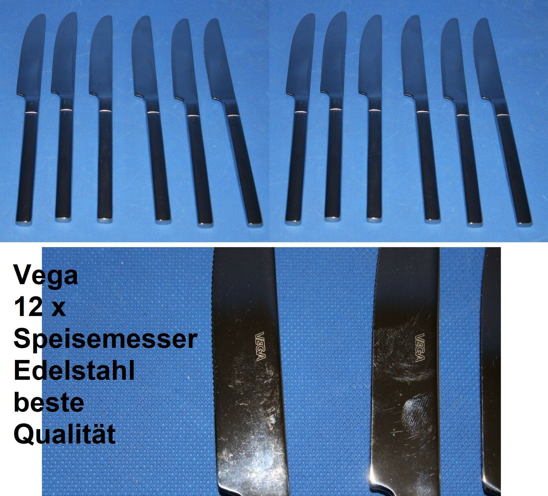 Vega 12 x Speisemesser Edelstahl beste Qualität NEU, unbenutzt, unbeschädigt Marke: Vega Anzahl der Teile: 12 Material: Edelstahl Farbe: Silberfarbend ca. 22,5 cm Gewicht: ca. 1100 g Versandkosten : 5,90 € / Abholung 0 €