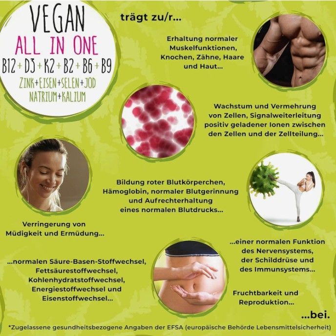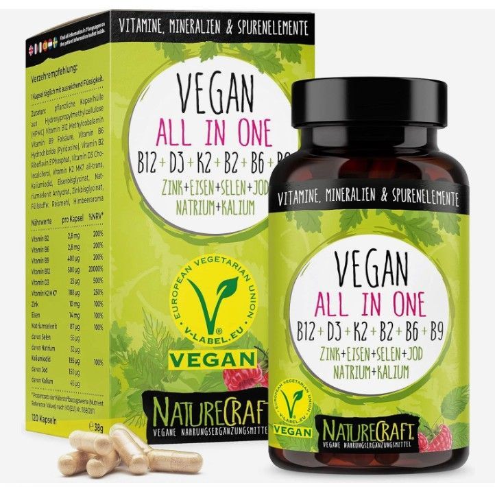 Vegan All-In-One - Vitamin B12 + D3 + K2 + B2 + B6 + B9 Folsäure + Zink + Eisen