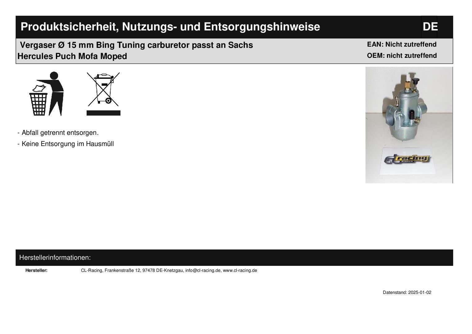 Vergaser ? 15 mm Bing Tuning carburetor passt an Sachs Hercules Puch Mofa Moped
