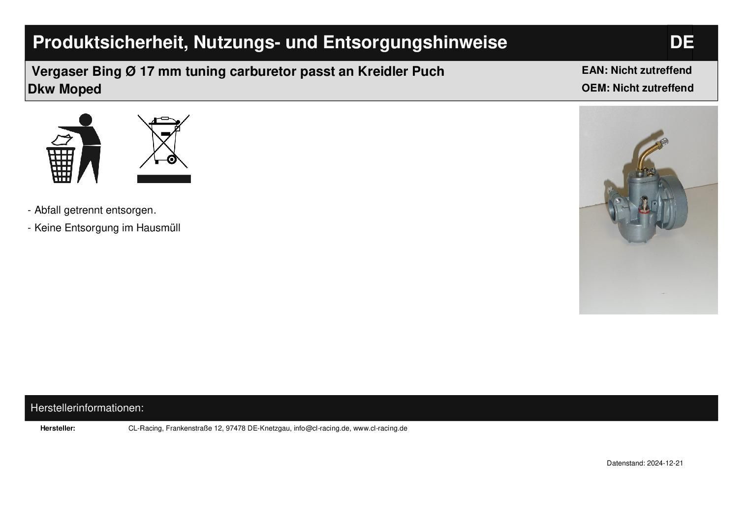 Vergaser Bing Ø 17 mm tuning carburetor passt an Kreidler Puch Dkw Moped