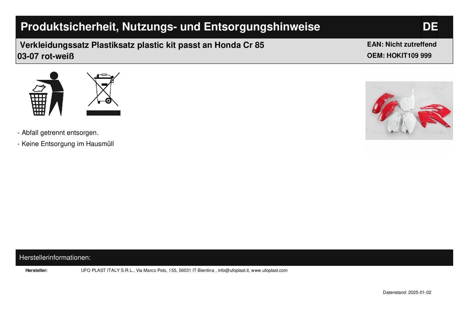 Verkleidungssatz Plastiksatz plastic kit passt an Honda Cr 85 03-07 rot-wei?