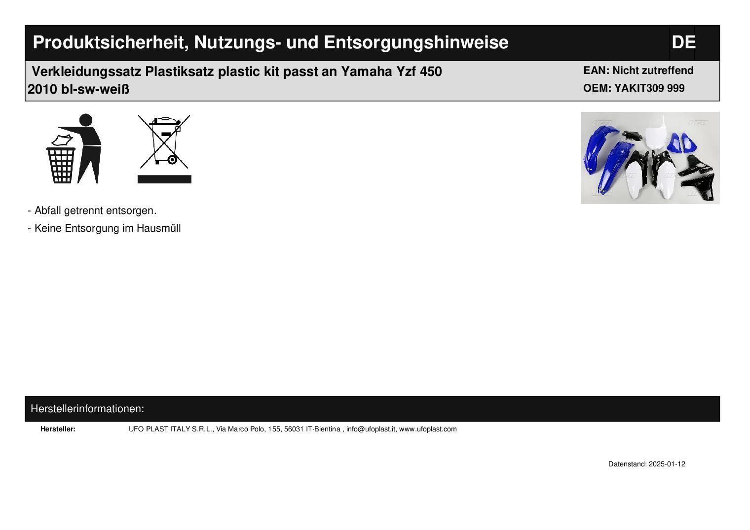 Verkleidungssatz Plastiksatz plastic kit passt an Yamaha Yzf Yz450f 2010 schwarz