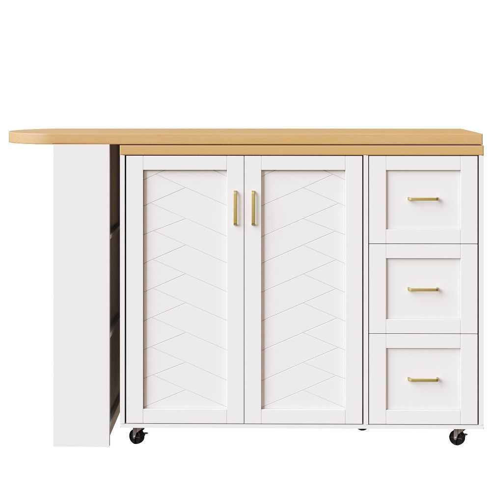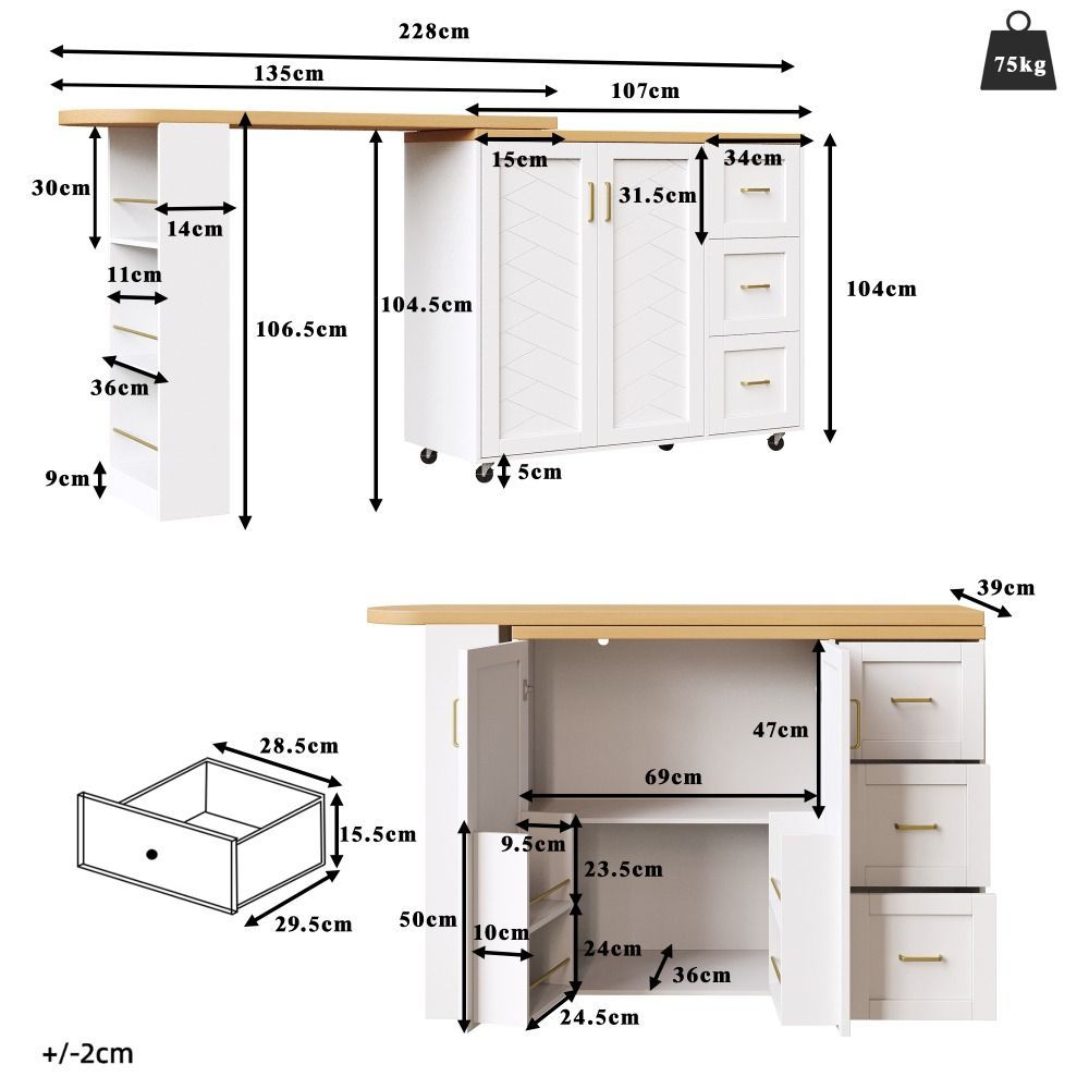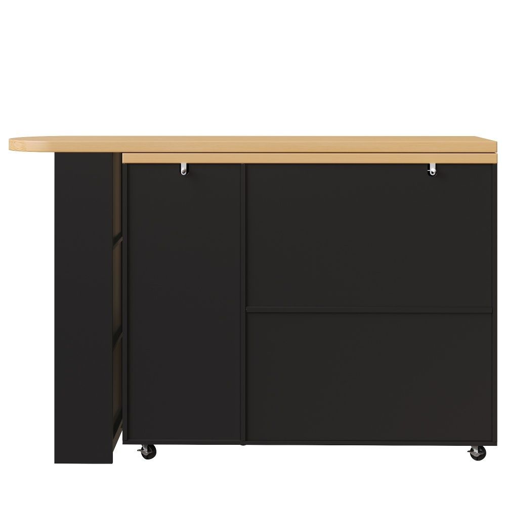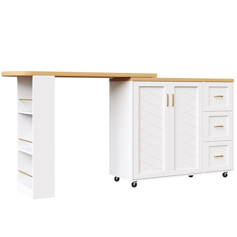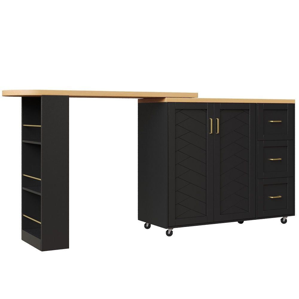 Verlängerbarer Barwagen in Weiß/Schwarz mit Arbeitsplatte in Holzoptik. Gefertigt aus MDF und Metall, bietet er eine moderne Optik und praktische Nutzung im Wohn- oder Essbereich. Mit 2 Türen, 3 Schubladen und rollbarer Ausführung schafft er flexiblen Stauraum. Maße: 135–228 x 39 x 104 cm, Gewicht: 50 kg.