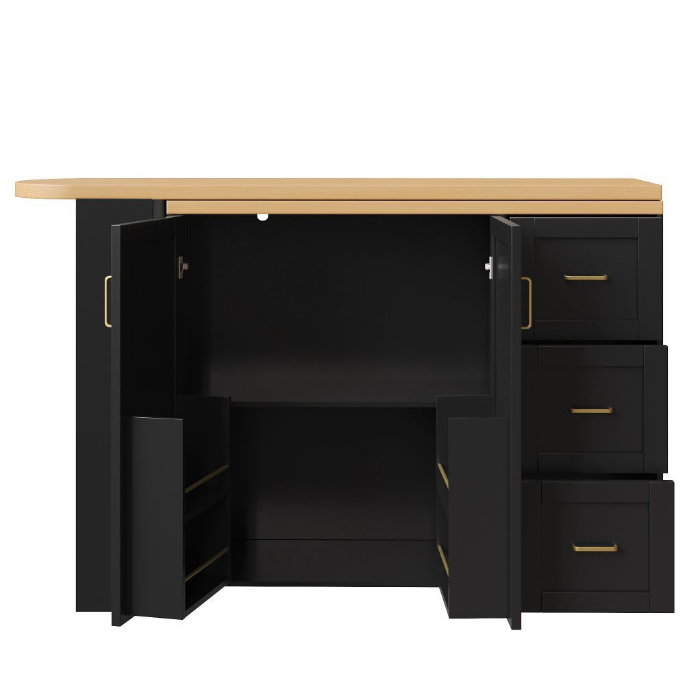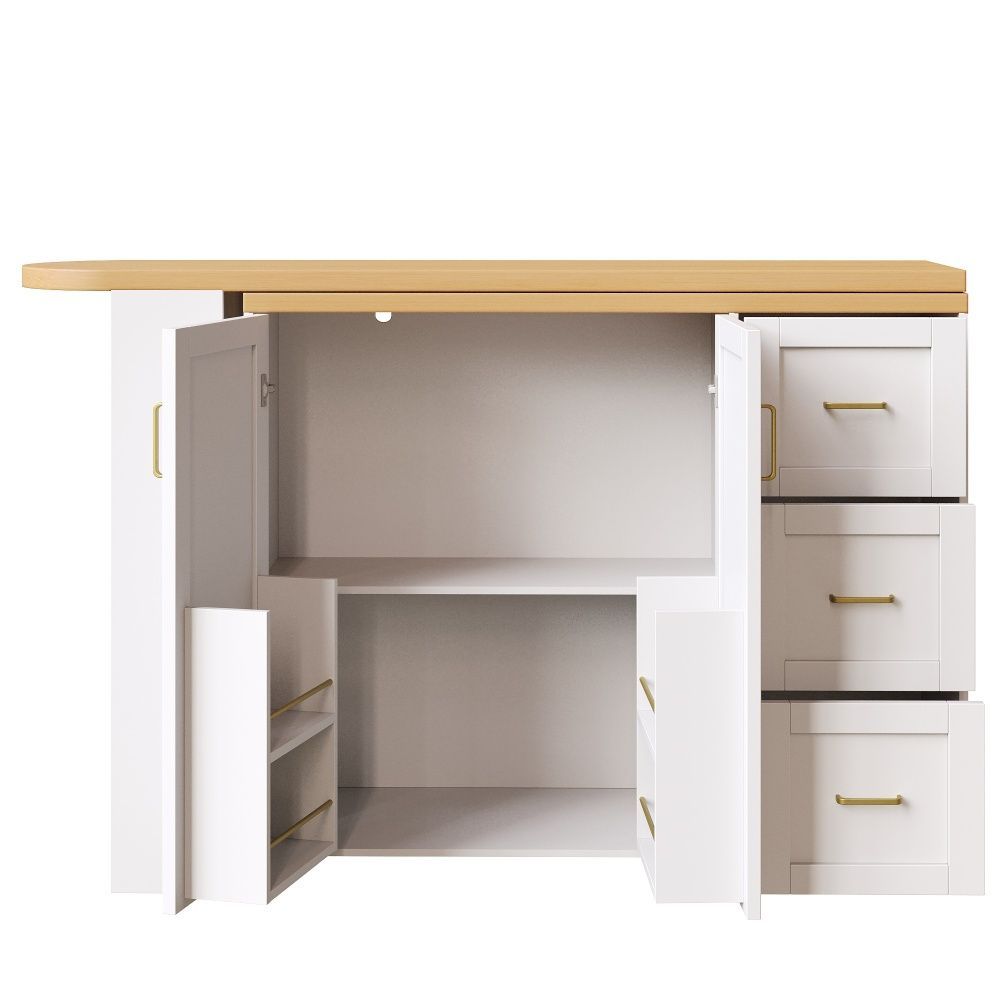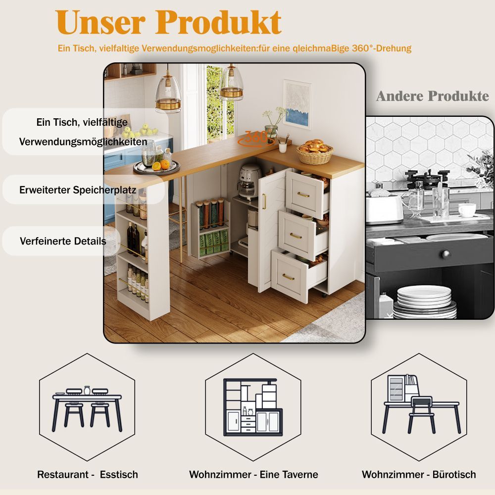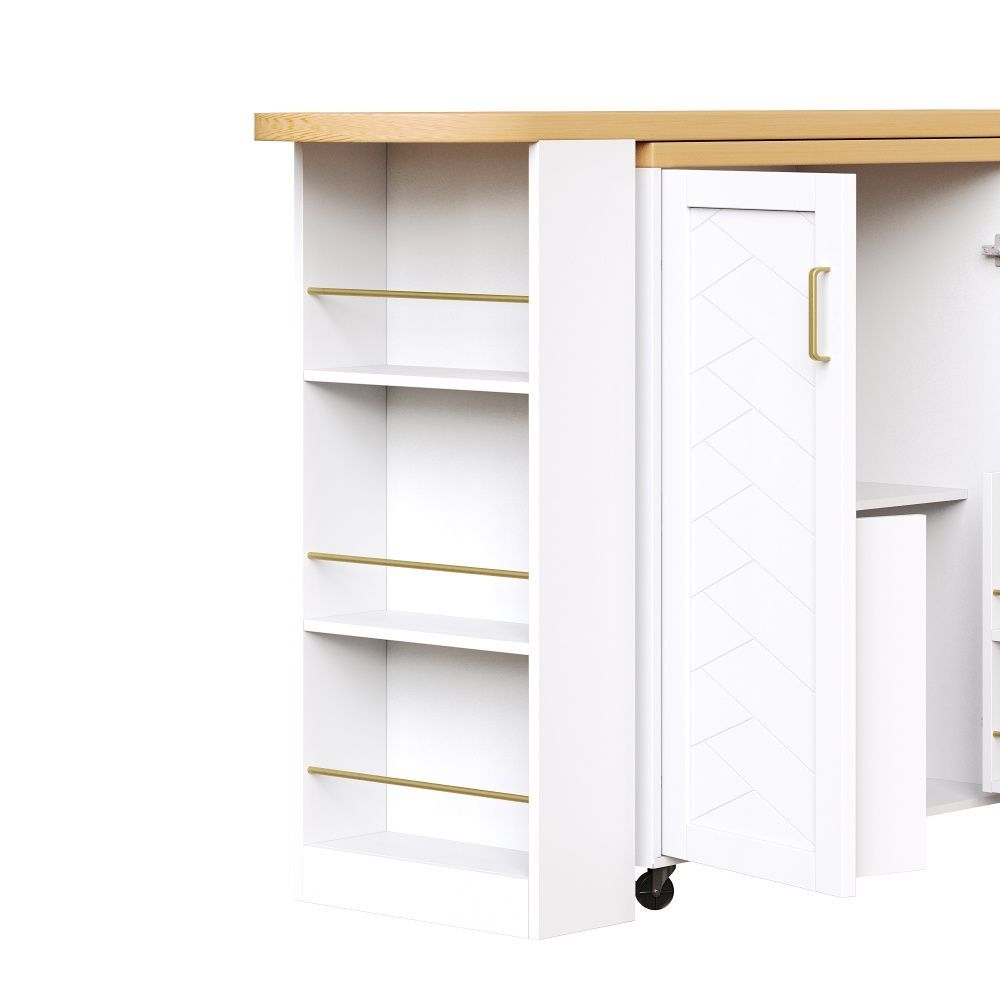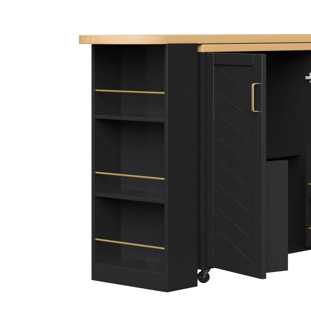 Verlängerbarer Barwagen in Weiß/Schwarz mit Arbeitsplatte in Holzoptik. Gefertigt aus MDF und Metall, bietet er eine moderne Optik und praktische Nutzung im Wohn- oder Essbereich. Mit 2 Türen, 3 Schubladen und rollbarer Ausführung schafft er flexiblen Stauraum. Maße: 135–228 x 39 x 104 cm, Gewicht: 50 kg.