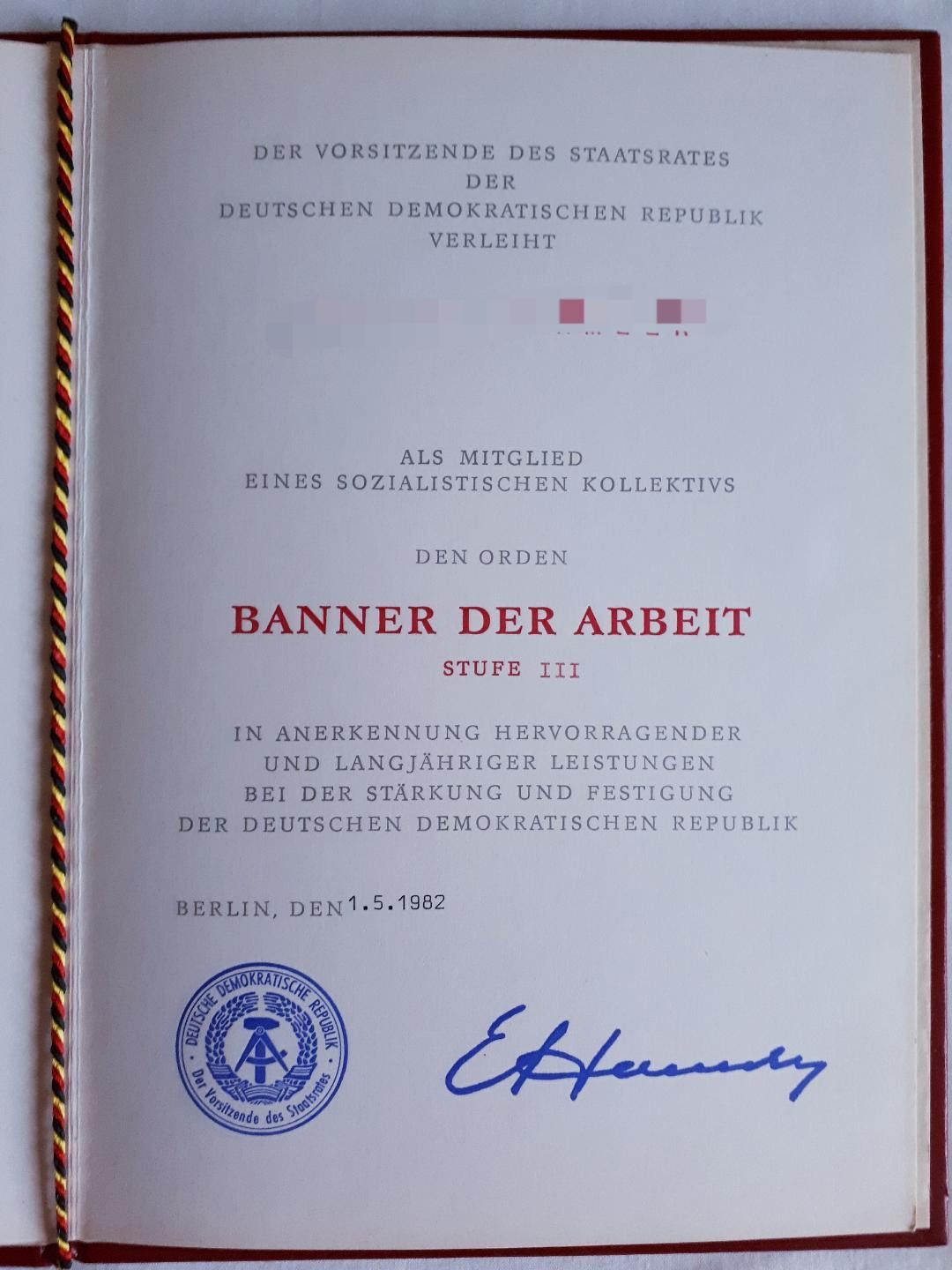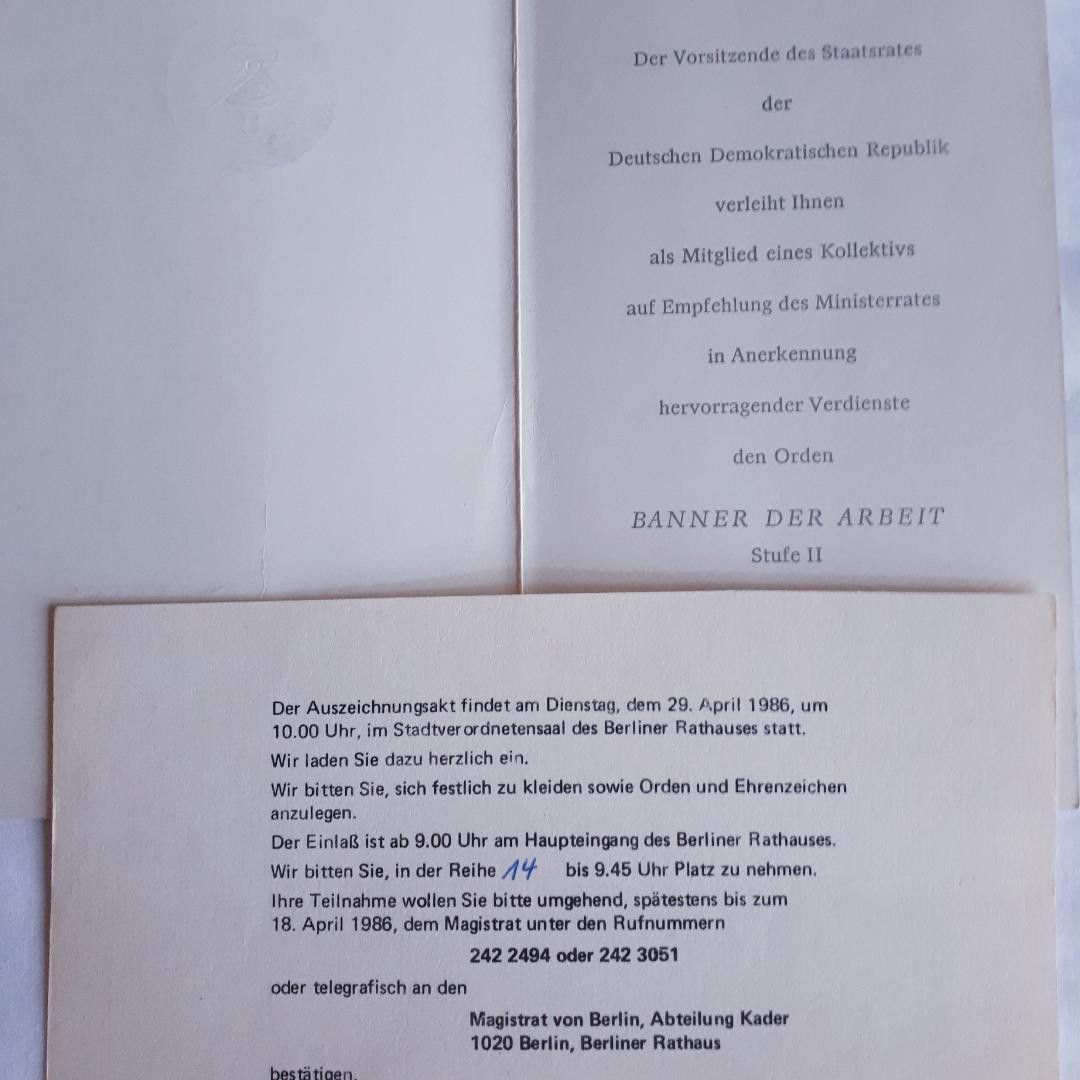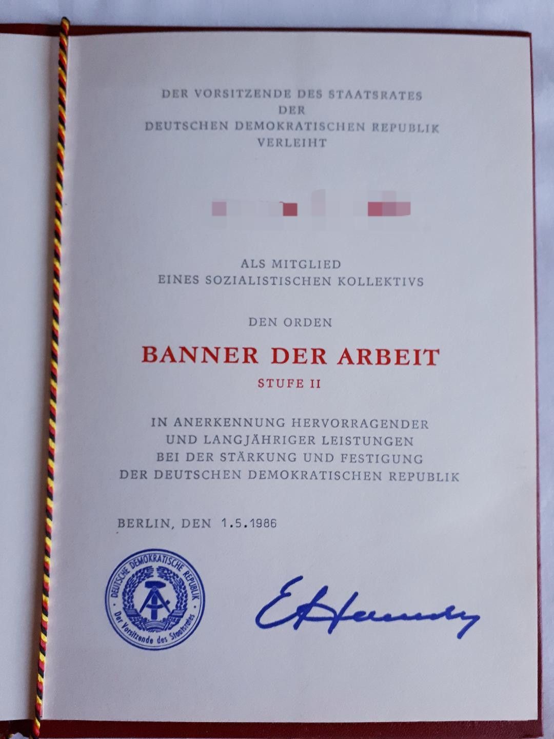 Verleihungsurkunde mit Mappe Banner der Arbeit * Mappenmaß: ca. 15,5 cm x 22 cm * die gewünschte Variante bitte in der Liste auswählen! Zustand: gut - gebraucht mit kleinen Gebrauchsspuren