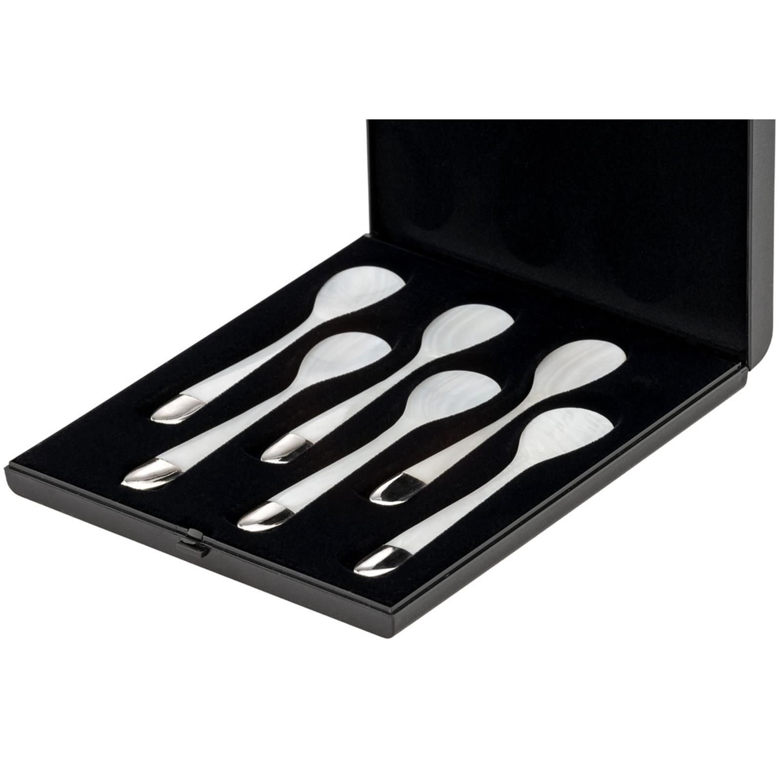versilbertes beigefarbenes Perlmutt Eierlöffel Set im Etui 6-teilig