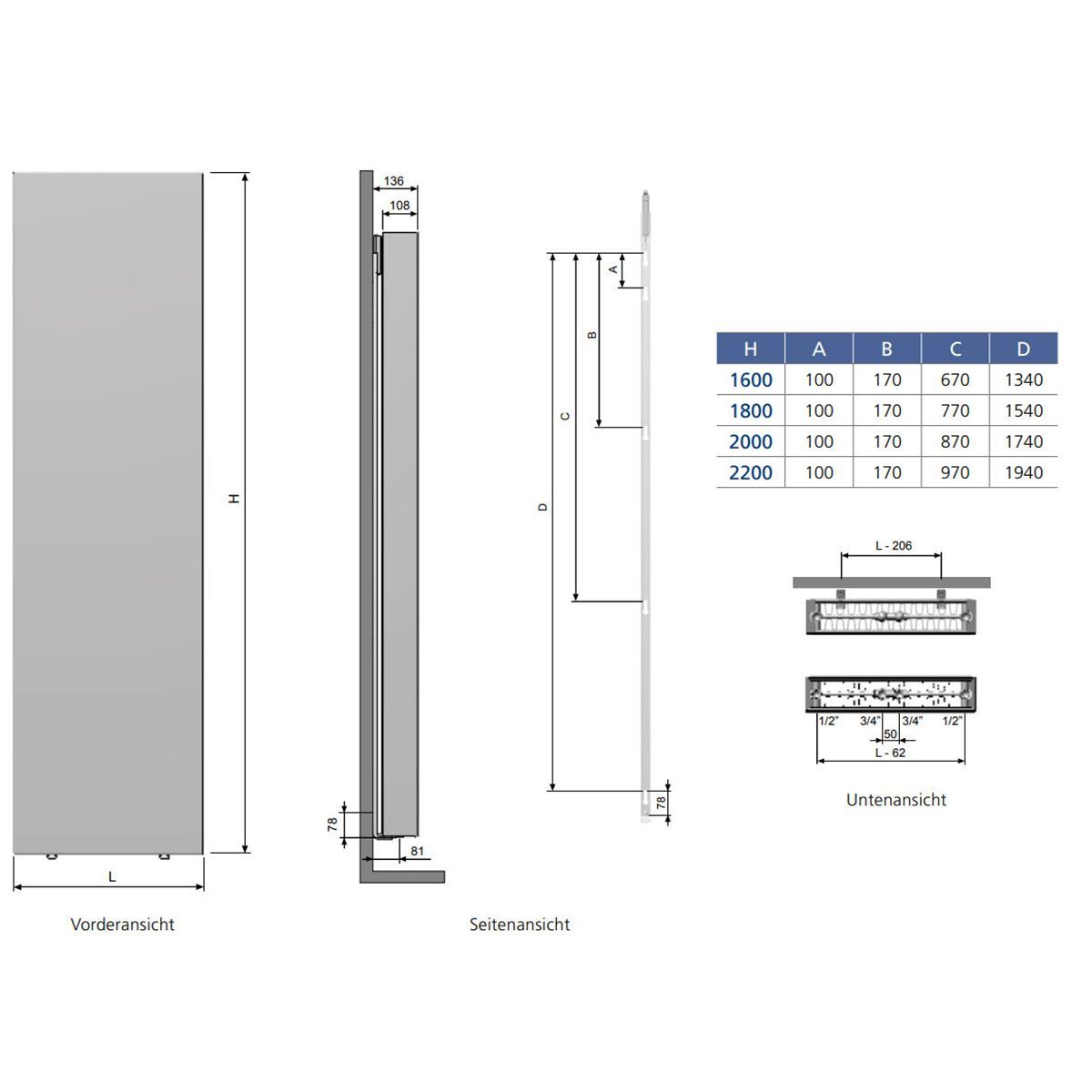 Vertikal Heizkörper Design Plan Wand Mittlenaschluss T22 2000 x 600 (HxB)-2263W