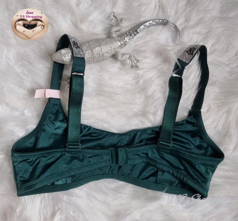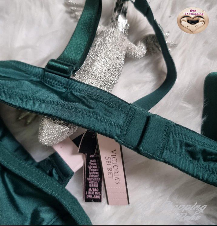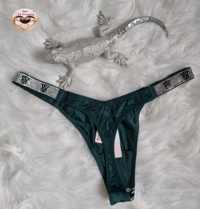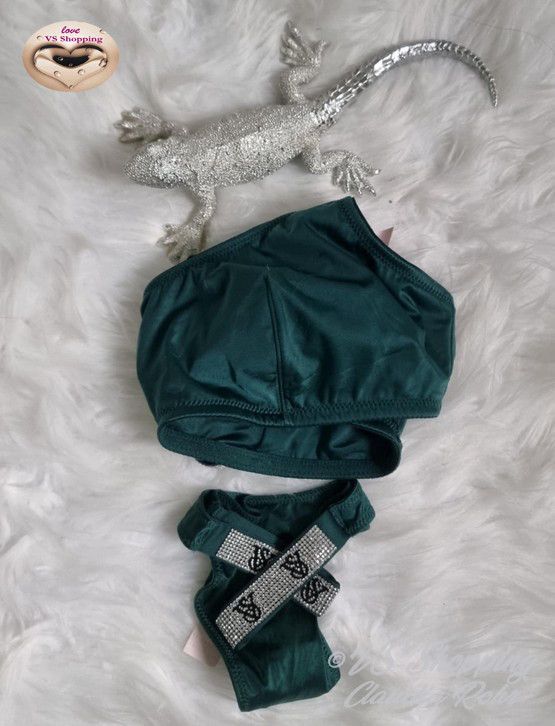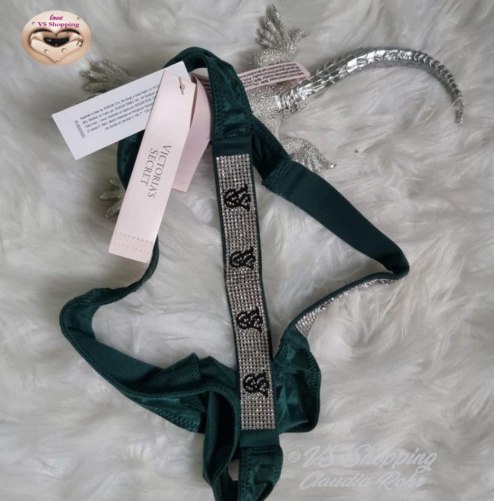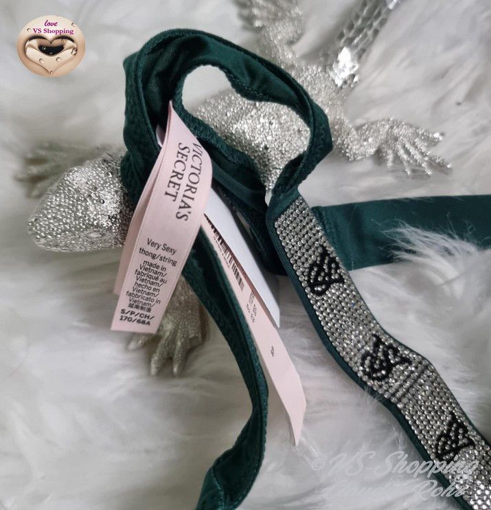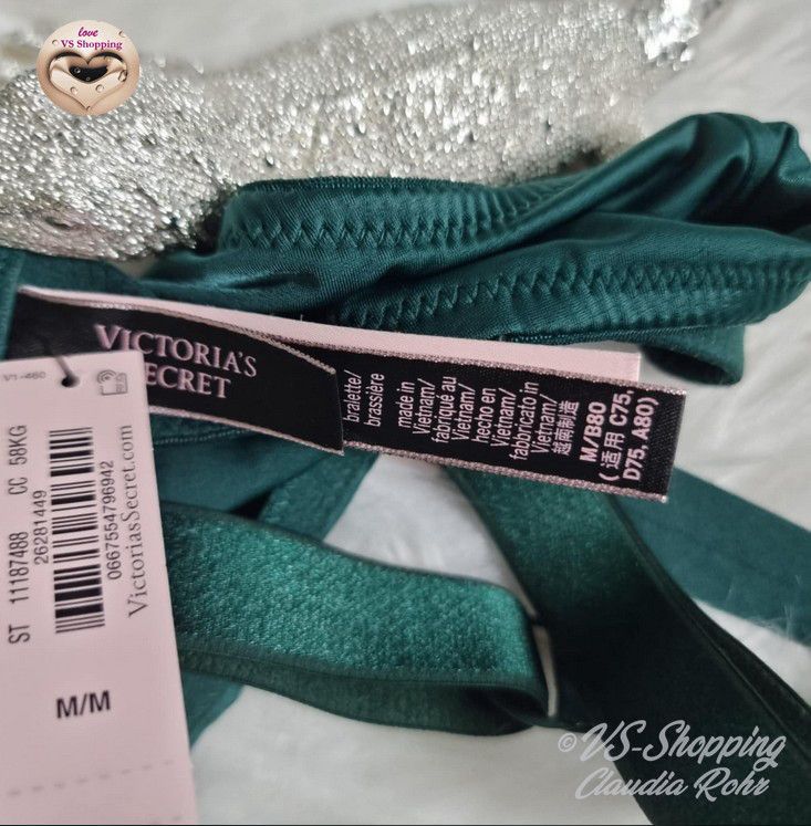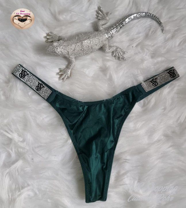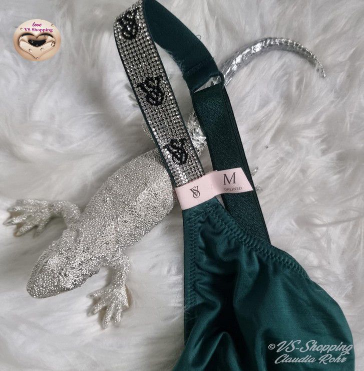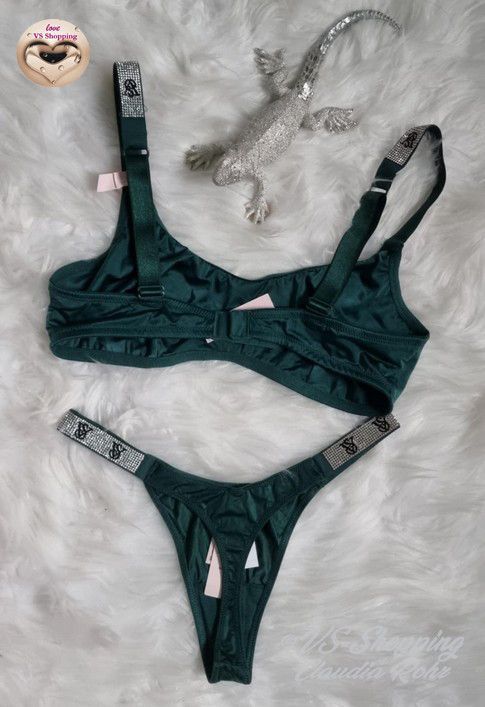 Victoria`s Secret Shine Strap Scoop Bralette mit Strass und String *Mystique Green *schimmernde VS-Strass Monogramm-Glanzträgern *nicht transparent *formgebende Nähte *Ungefüttert, aber mit Innenstoff *tiefer Dekolteeausschnitt-Körbchengröße A max. kleines B *Bralette: 85% Polyamid, 15% Elastan **String mit VS Strassriemchen** *String Po Abdeckung *Hoher Beinausschnitt *88% Polyamid, 12% Elastan