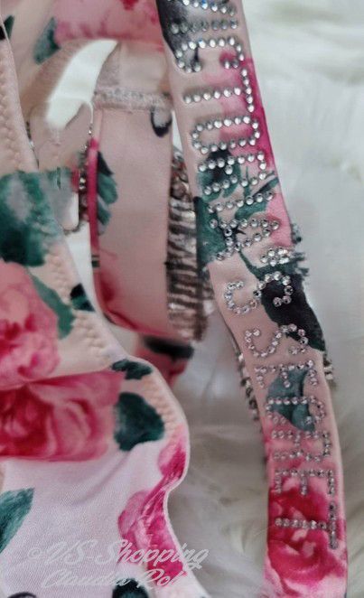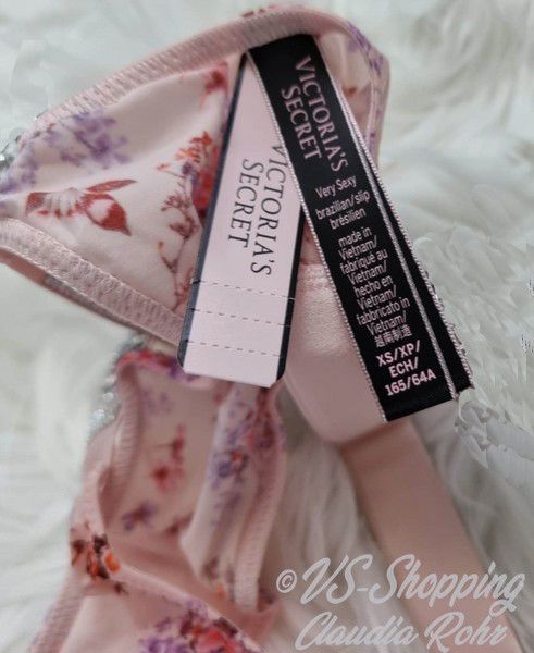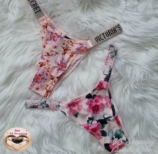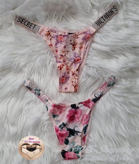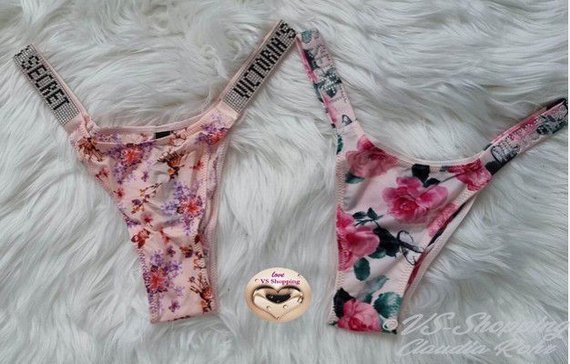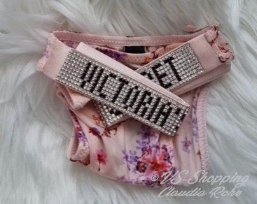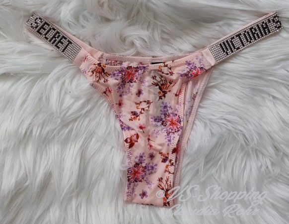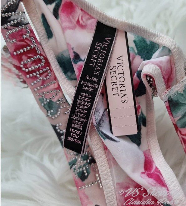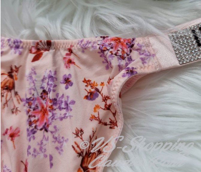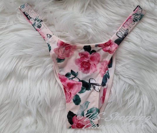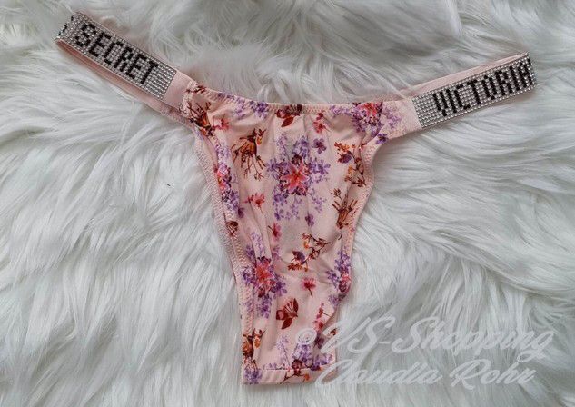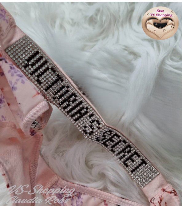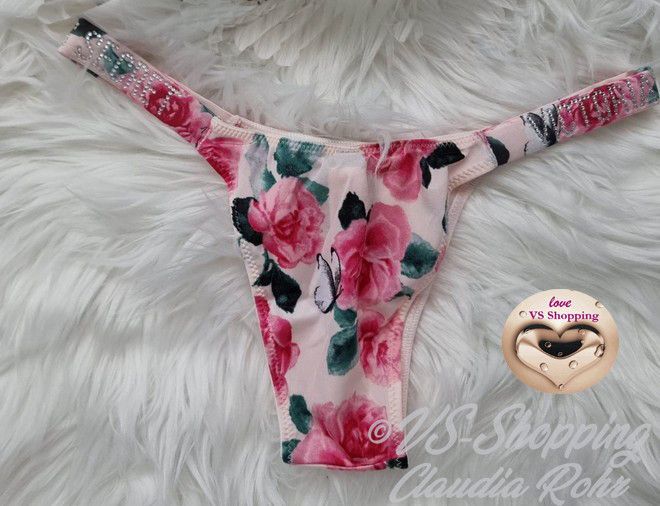 Victoria`s Secret ** Very Sexy ** glänzender String mit Strass ** Farbe: rose mit Lilac Blumen oder ** call me Rose ** komplette Strassriemchen bei rose mit Lilac **Strass Steinchen Logo bei call me Rose ** Knappes Design ** Brazilian Po Abdeckung ** Minimale Po Abdeckung ** Riemchen aus Strass mit