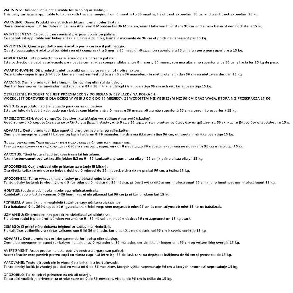 • WARNUNG Lassen Sie Ihr Kind nie unbeaufsichtigt. Diese Sitzeinheit ist nicht für Kinder unter 6 Monaten geeignet. Immer die Sicherheitsgurte benutzen. Während der Verwendung als Kinderwagen darf keine zusätzliche Matratze hinzugefügt werden. Warnung. Dieses Produkt ist nicht zum Laufen oder Skaten geeignet. WARNUNG. Lass das Kind niemals unbeaufsichtigt.