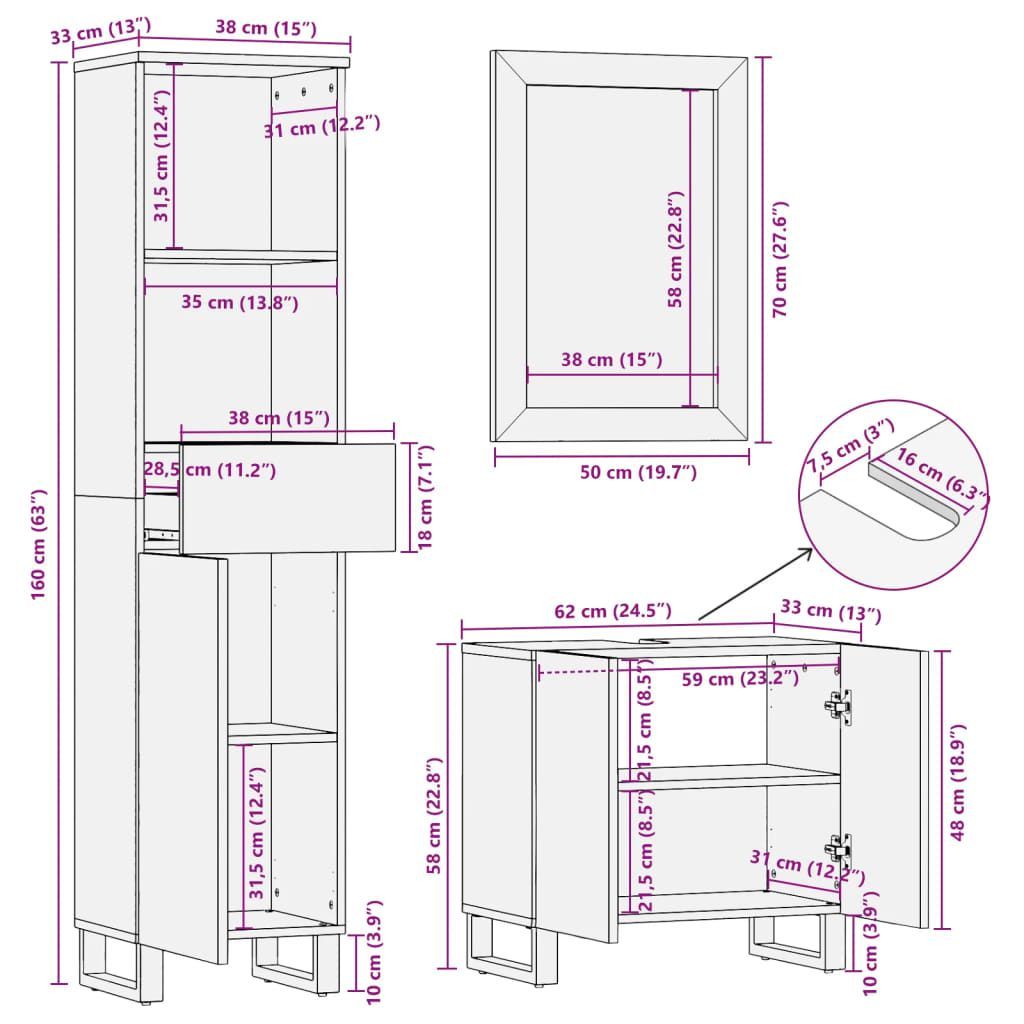 vidaXL vidaXL 3-tlg. Badmöbel-Set Raues Mangoholz