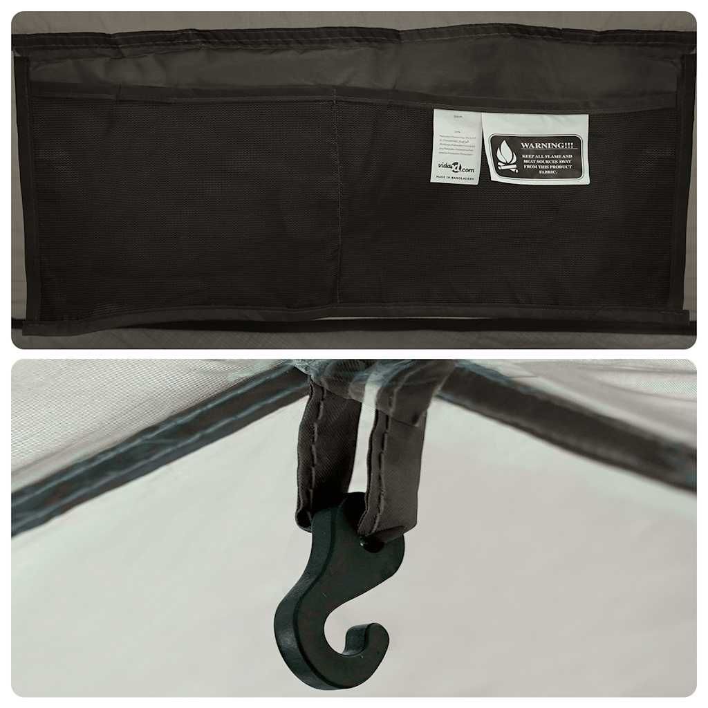 • Achtung Halten Sie alle Flammen und Wärmequellen von diesem Produktgewebe fern. Das Produkt ist nicht für Witterungsbedingungen wie starken Wind, Schneefall und extreme Wetterbedingungen geeignet.