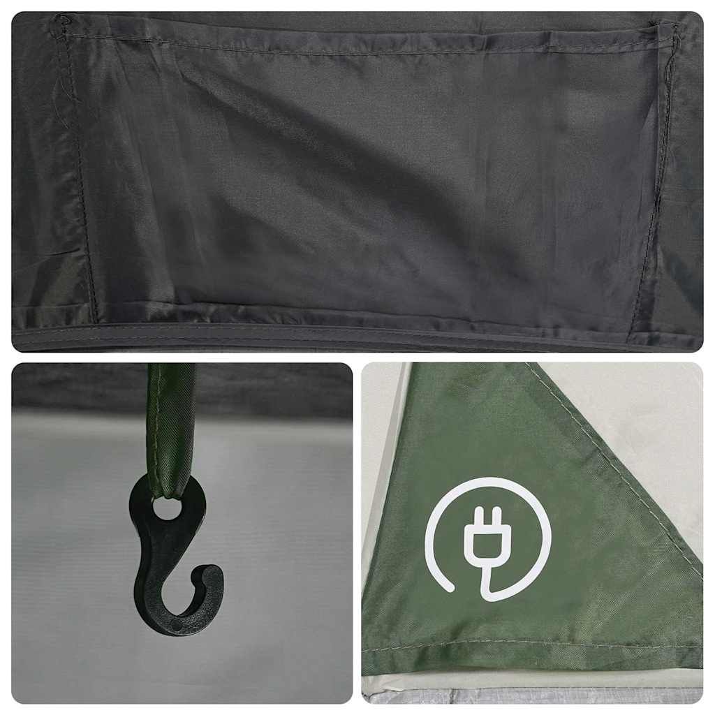 • Achtung Halten Sie alle Flammen und Wärmequellen von diesem Produktgewebe fern. Das Produkt ist nicht für Witterungsbedingungen wie starken Wind, Schneefall und extreme Wetterbedingungen geeignet.