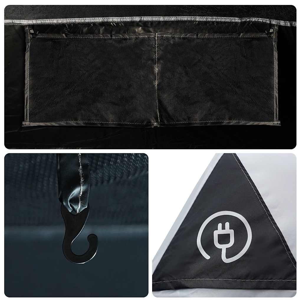 • Achtung Halten Sie alle Flammen und Wärmequellen von diesem Produktgewebe fern. Das Produkt ist nicht für Witterungsbedingungen wie starken Wind, Schneefall und extreme Wetterbedingungen geeignet.