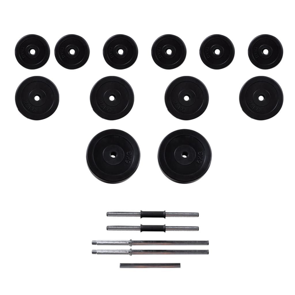 Griffgröße: ca. 14,5 cm (Langhantel), 10 cm (Kurzhantel) Hantelscheibe: Polyethylenguss Langhantelstange: Ø2,5 cm, 140 cm Länge, 2 kg Kurzhantelstange: Ø2,5 cm, 45 cm Länge, 0,5 kg 1,25 kg Hantelscheibe: Ø 17,5 cm, 3 cm stark 2,5 kg Hantelscheibe: Ø 22 cm, 4 cm stark 5 kg Hantelscheibe: Ø 27 cm, 4,5 cm stark Gesamtgewicht einschließlich Stangen: 30,5 kg Gesamtgewicht der Hantelscheiben: 27,5 kg Maximale Tragfähigkeit der Hantelstange: 120 kg