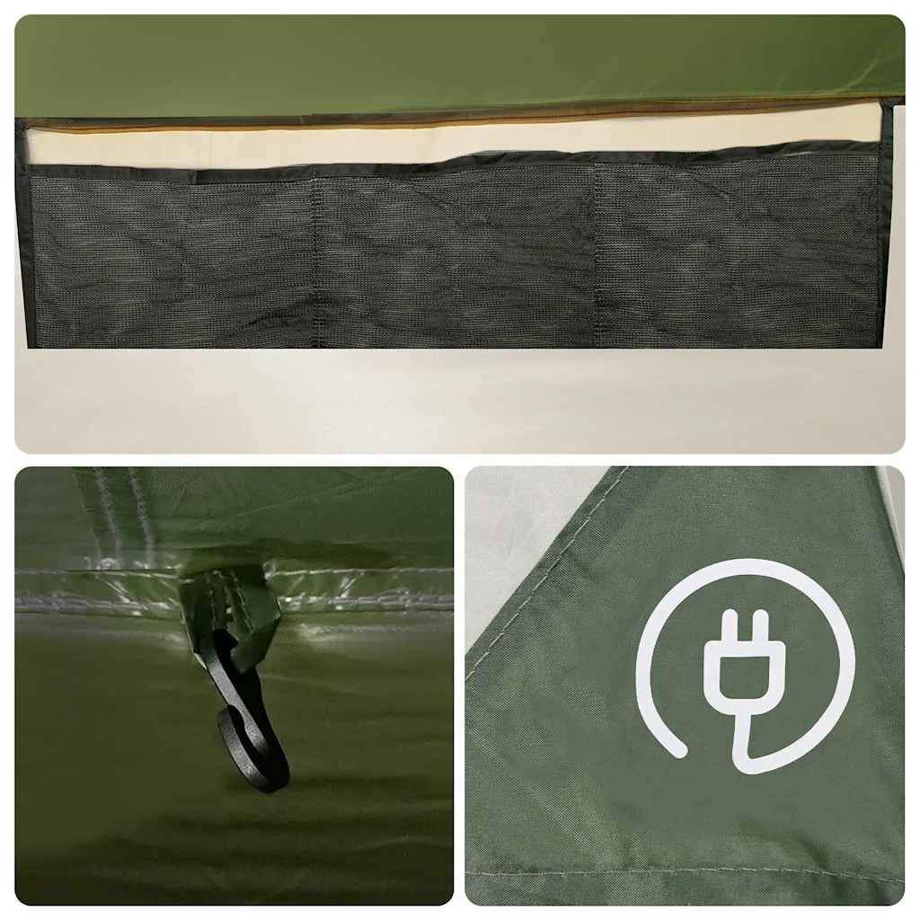 • Achtung Halten Sie alle Flammen und Wärmequellen von diesem Produktgewebe fern. Das Produkt ist nicht für Witterungsbedingungen wie starken Wind, Schneefall und extreme Wetterbedingungen geeignet.