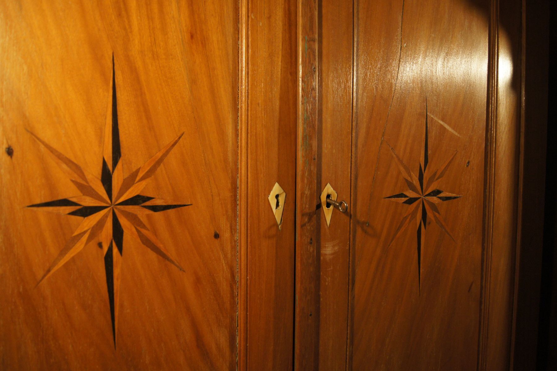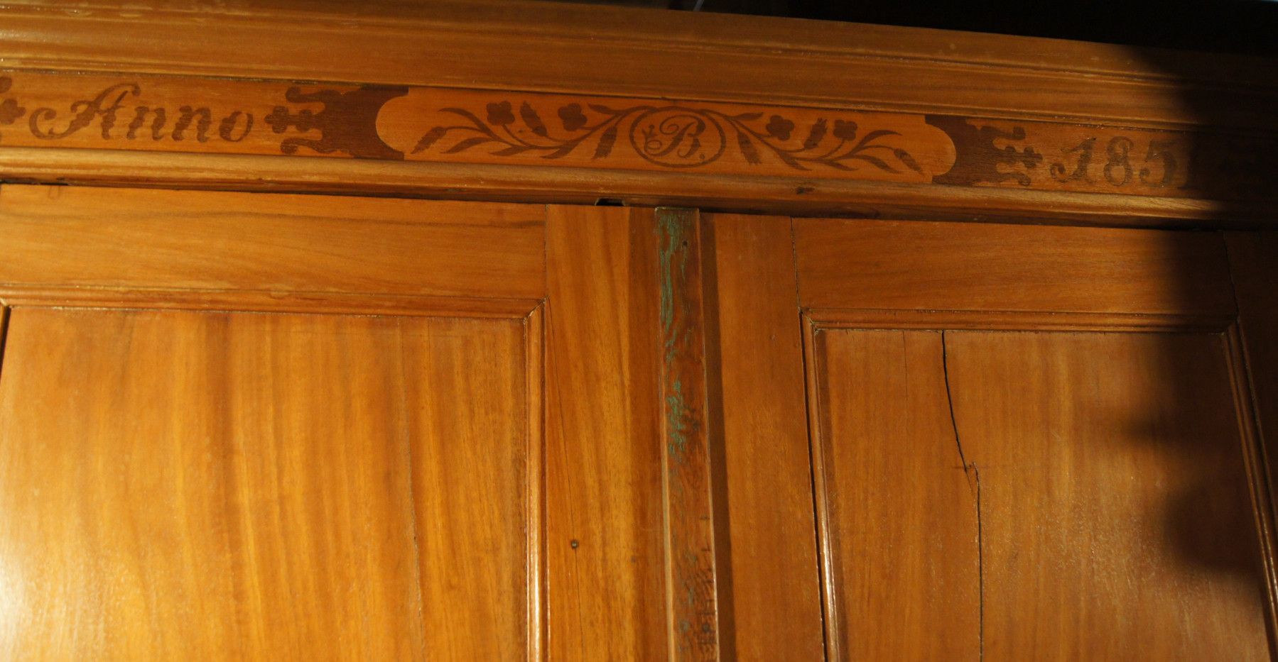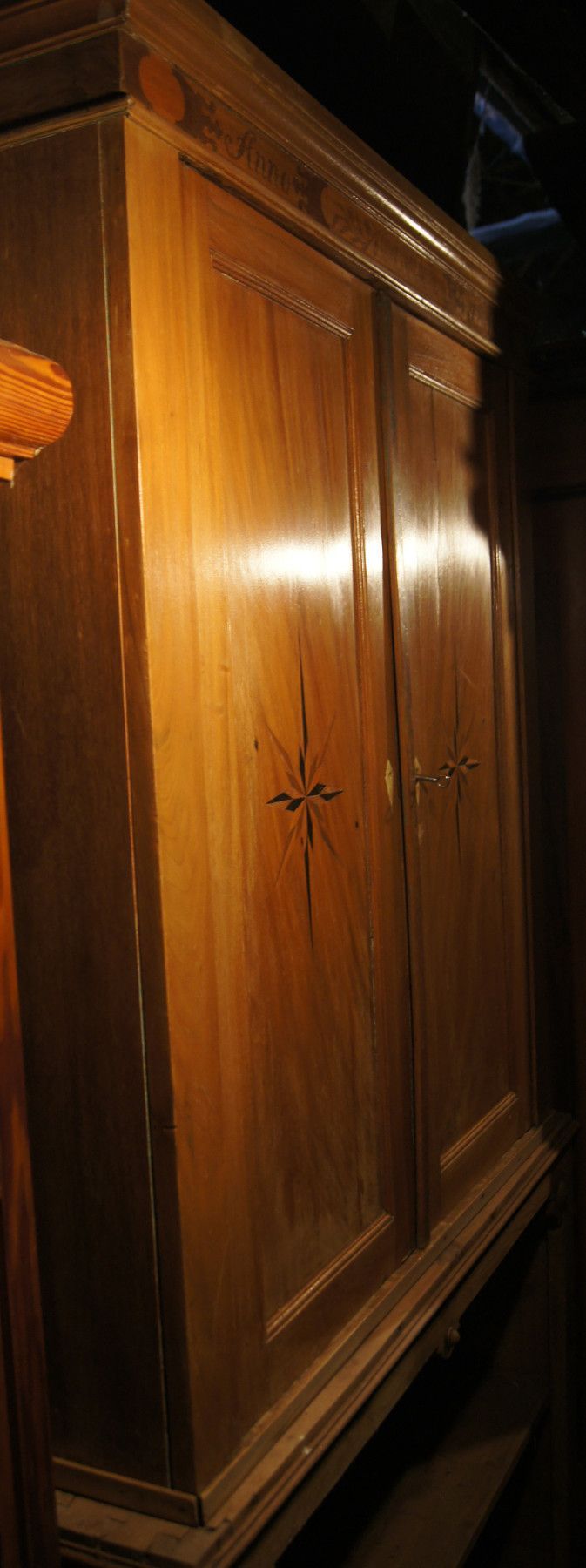Schränkchen um 1850 (Biedermeier). Herkunft: Hamburg-Vierlanden. N icht zerlegbar. Material: Nussholz hell, intarsiert. Maße: H 109, B 98, T 30, Innentiefe 22 cm. Lieferung im Umkreis von 30 km frei Haus! Sonst Transport mit Spedition möglich (je nach Angebot und Entfernung!). Der angegebene Versand