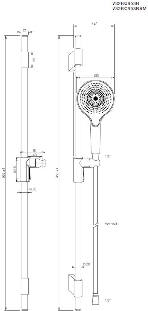 Vigour Brausegarnitur individual 3.2 Stange 95cm Schlauch + HB 3-strahlig rund