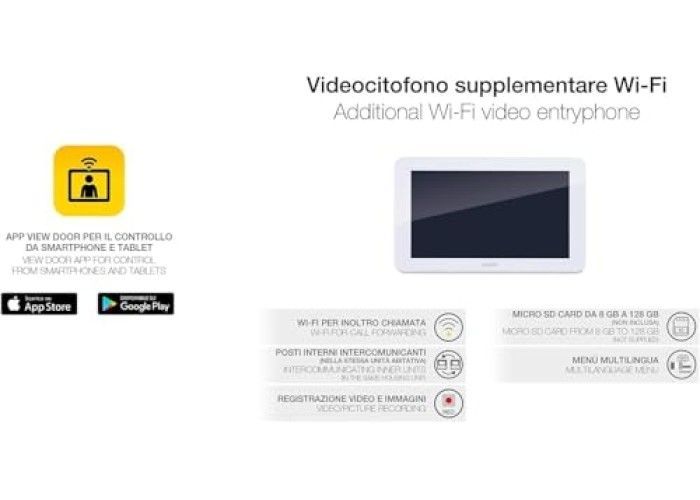 Monitor mit integriertem WLAN: Die Innenpfosten kommuniziert mit Smartphone und Tablet; Das Chiamat-Videocitofoniche kann von der Eizelle gezeugt werden Erweiterbarkeit: Eine Erweiterung des Systems ist durch den Anschluss von 3 Monitoren für eine Wohneinheit und 2 Außenpanels möglich. Gegensprechan... Mehr
