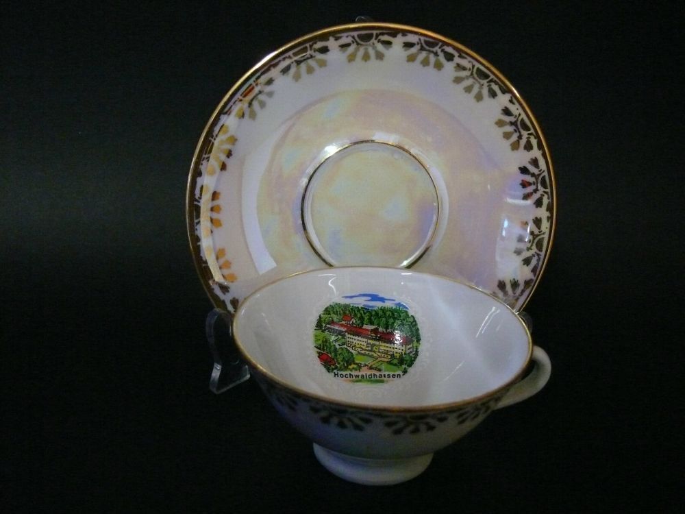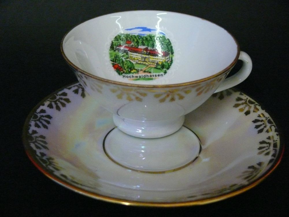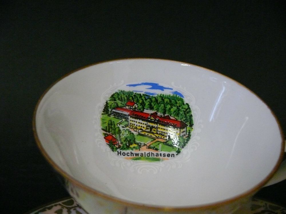 mit Ansicht Foto von Stadt Hochwaldhausen mit Goldrand und Gold Malerei - Andenken Sammeltasse mit Ansicht Foto von Stadt Hochwaldhausen, Gedeck Porzellan 2 tlg. Gerold Porzellan Bavaria Jaeger & Co Germany Mokka Tasse und Untertasse Dekor: Gold Malerei Goldrand mit sehr schöne Foto Ansicht von