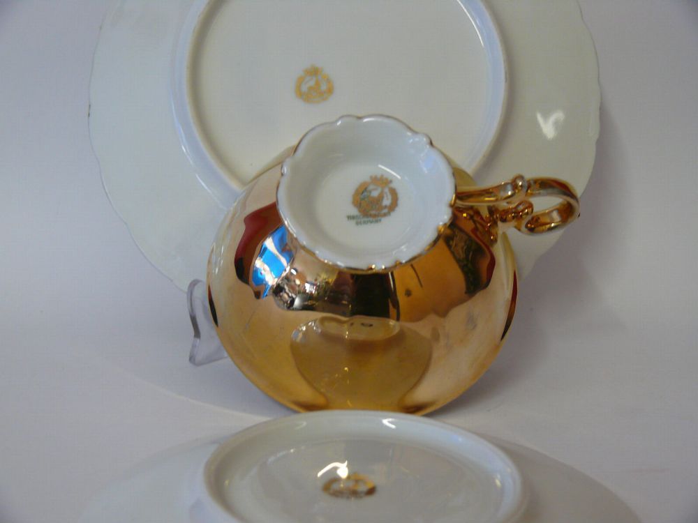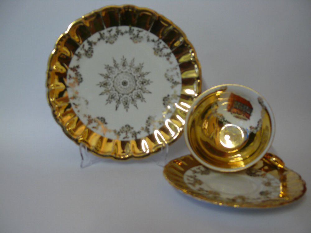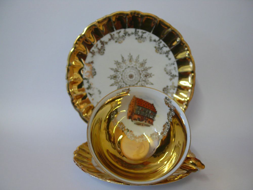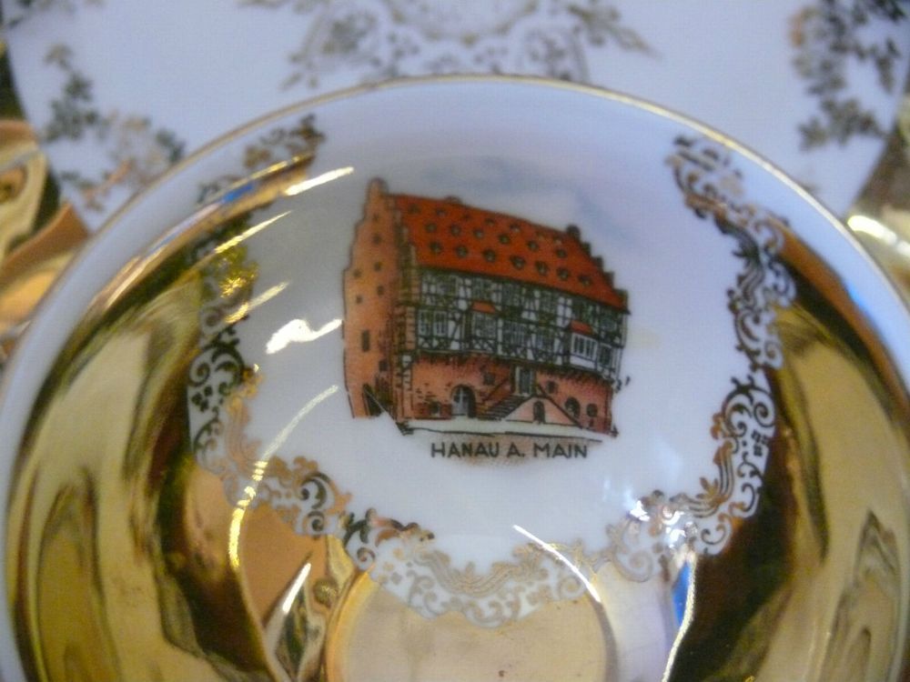 Andenken Sammeltasse mit Sockel Gedeck Porzellan 3 tlg. Tirschenreuth Porzellan Hallerstein Bavaria Germany mit Stadt Ansicht Hanau am Main Dekor: Gold Malerei Goldene Floral - Goldrand mit sehr schöne Foto Ansicht von Stadt Hanau am Main eingefasst in polierte Goldrahmen Hersteller Bodenmarke: Tirs