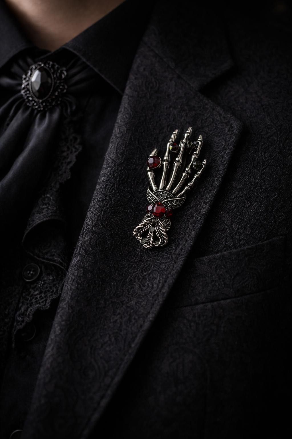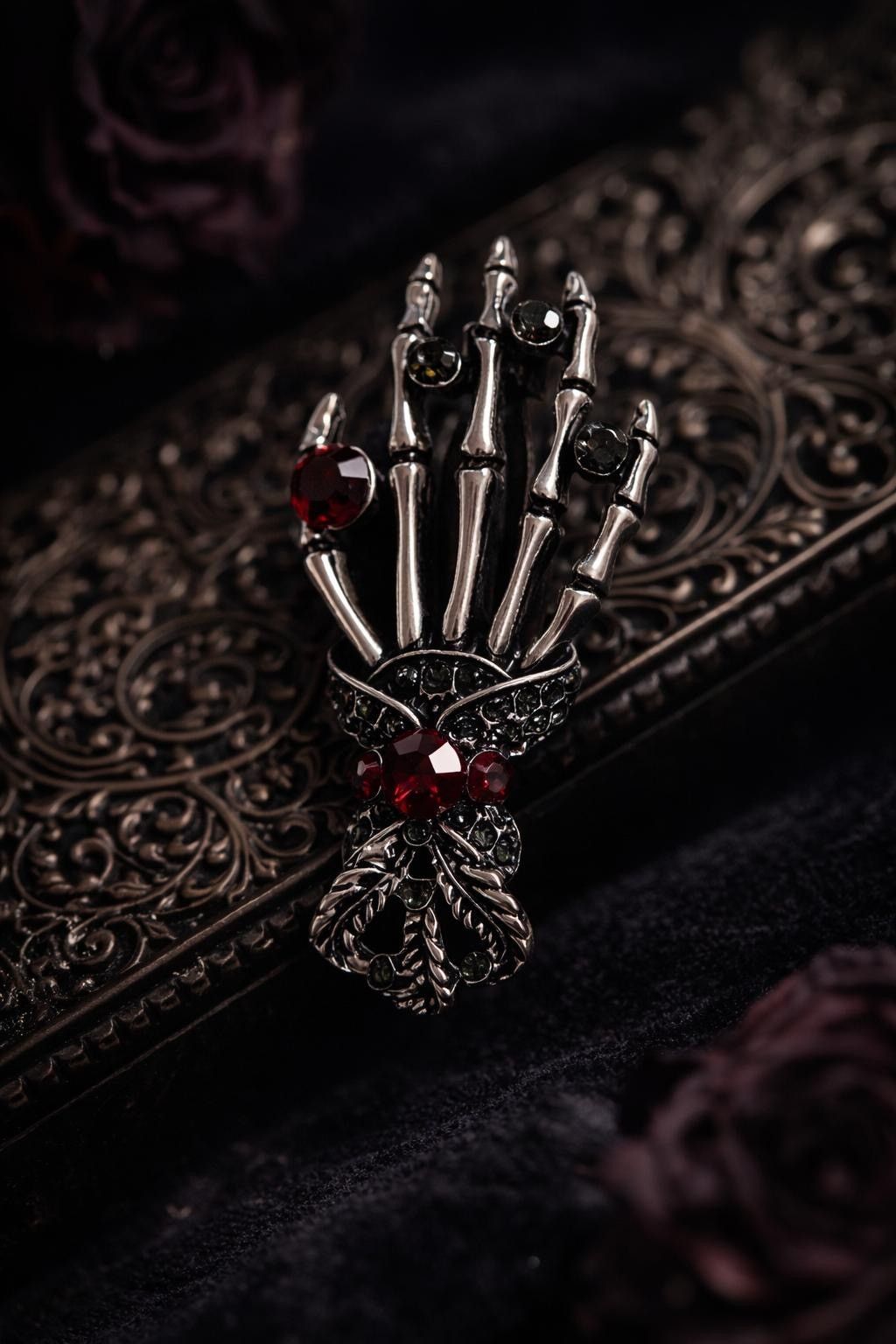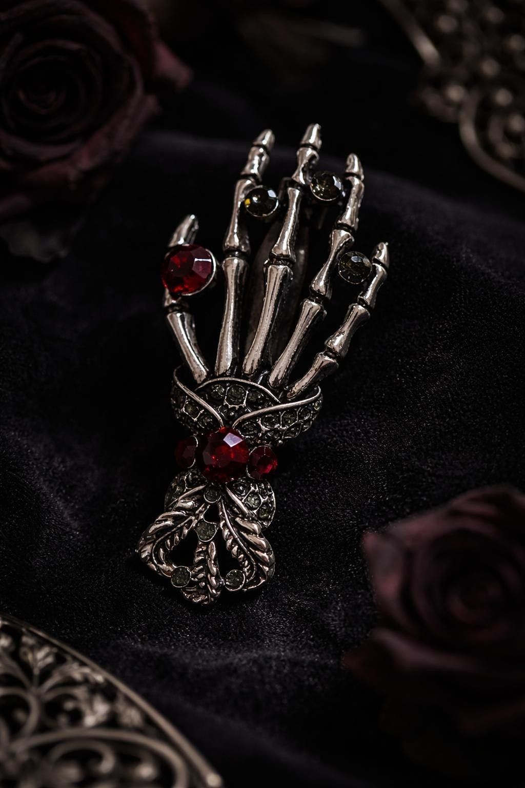 Vintage Emaille Brosche Skelett Hand mit Strasssteinen
