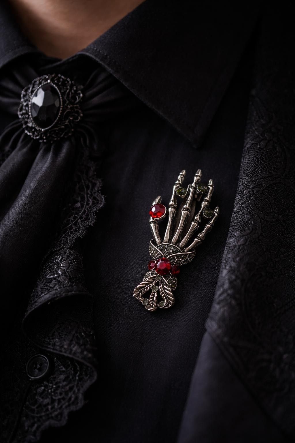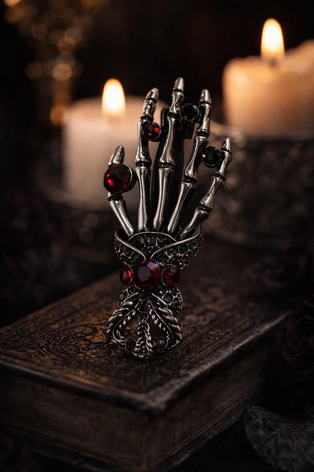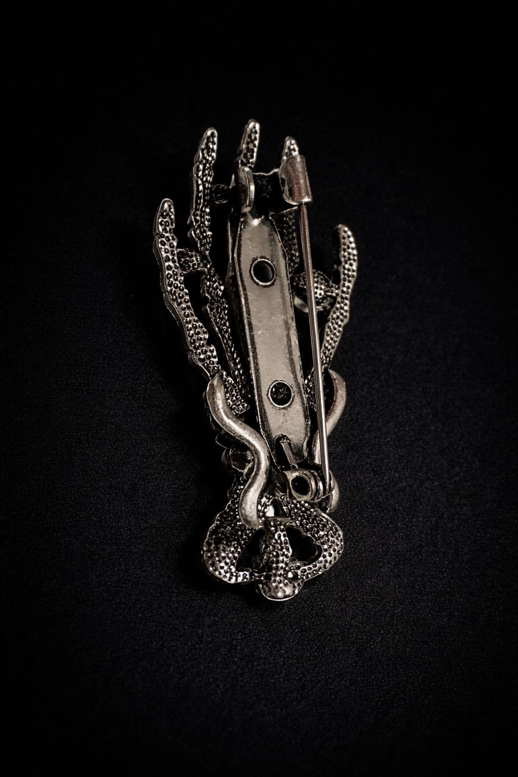 Vintage Emaille Brosche Skelett Hand mit Strasssteinen