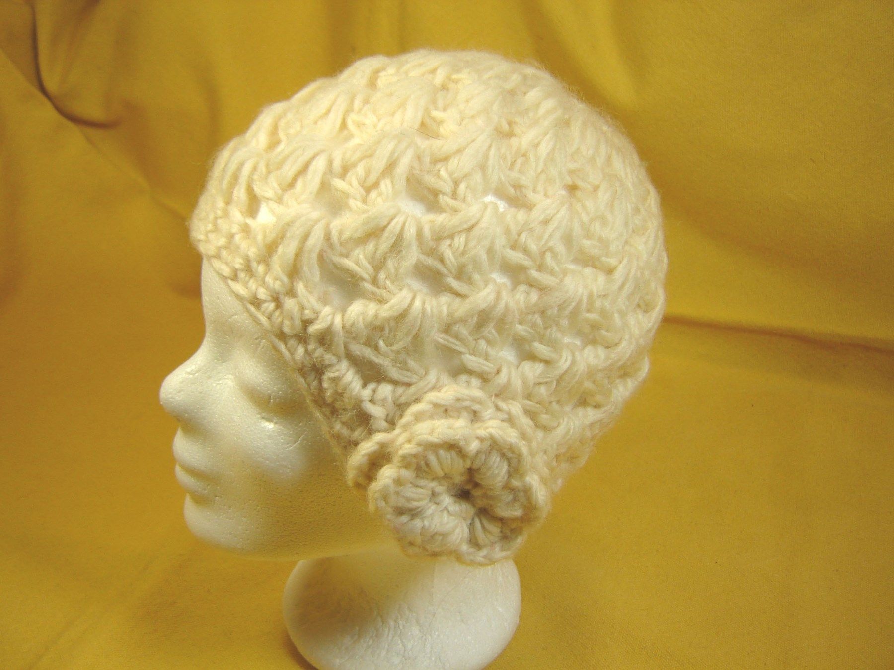 Vintage Häkelmütze mit Rosette mit Muster Wintermütze beige p B9 Z