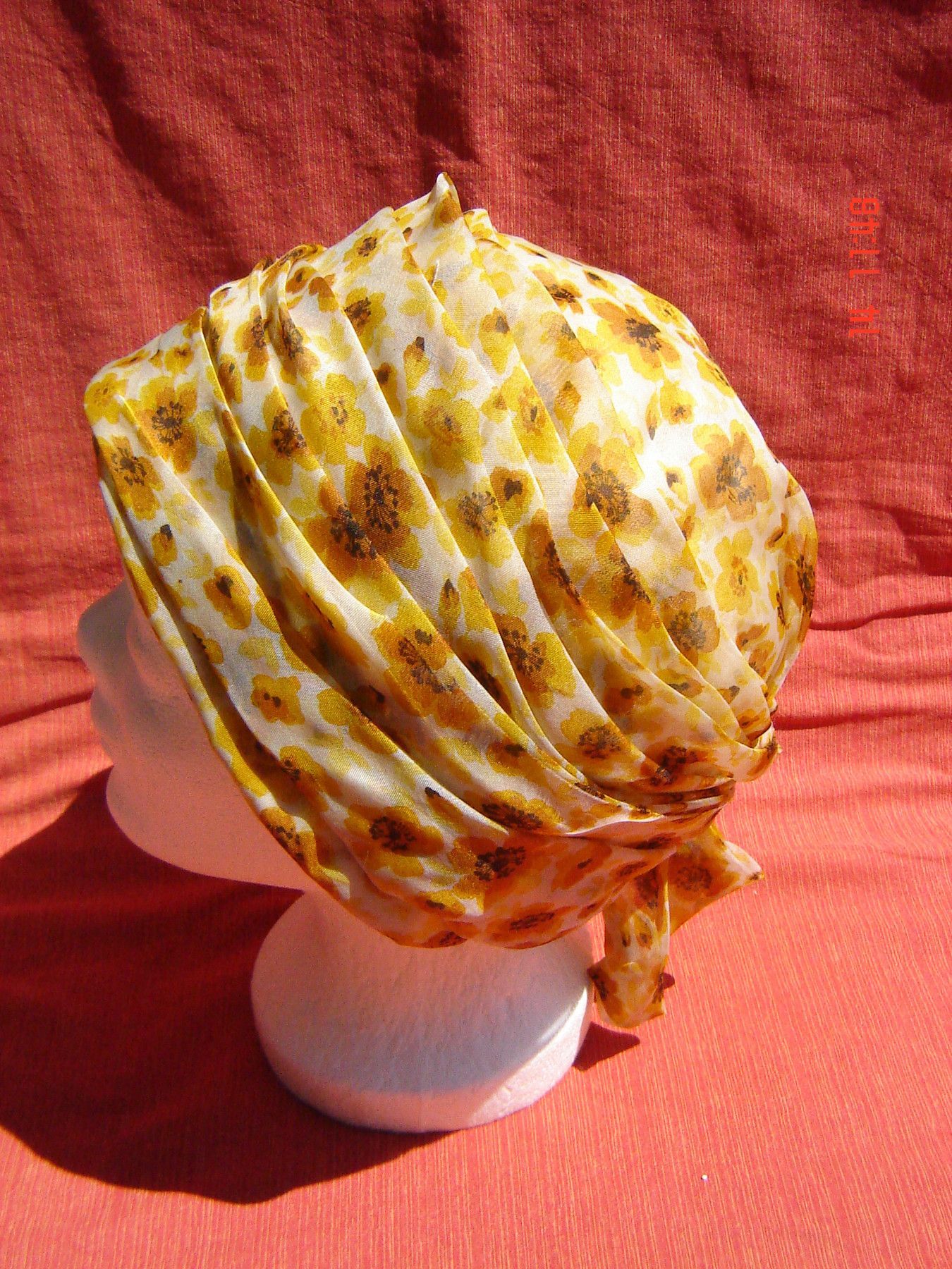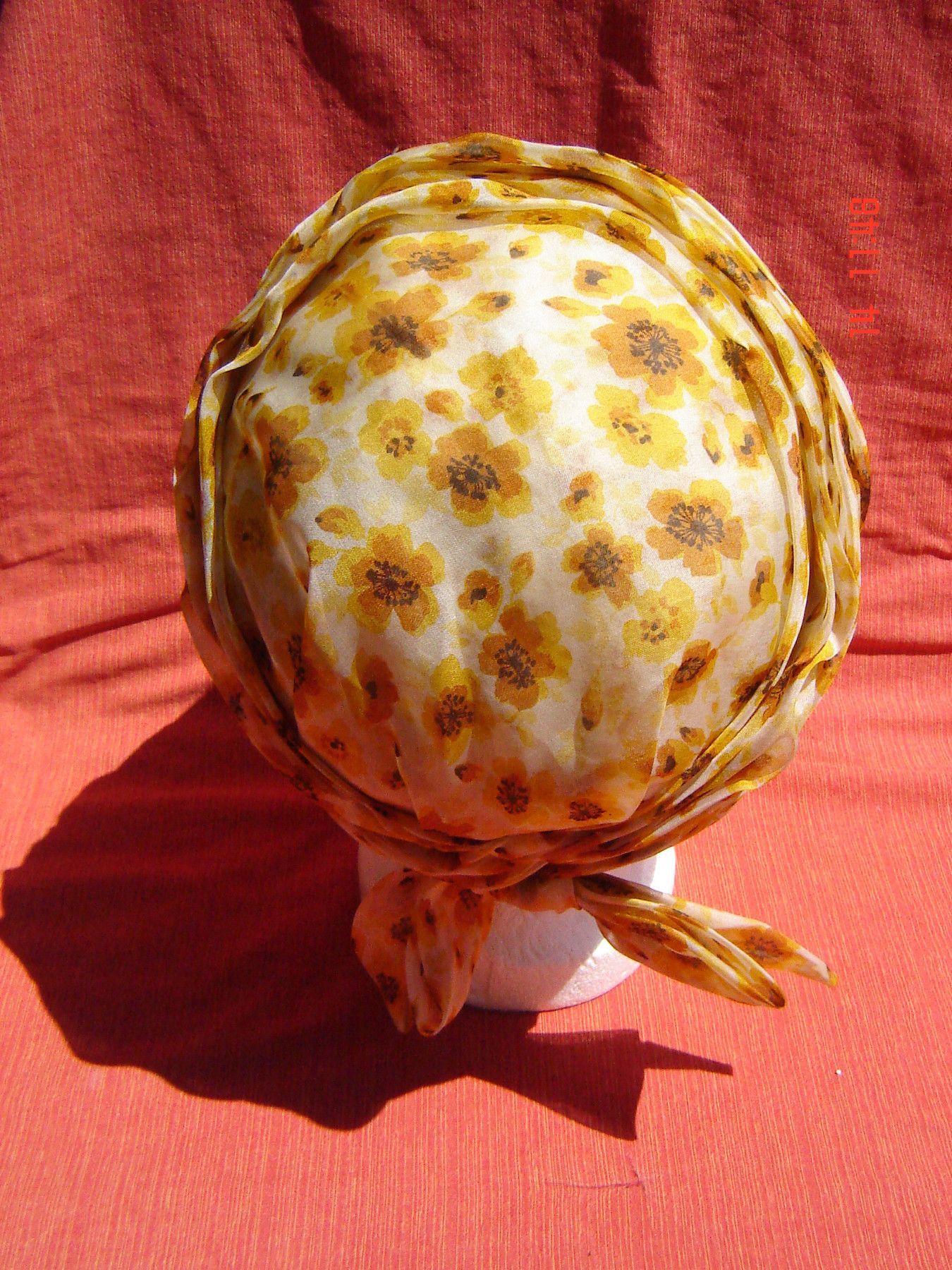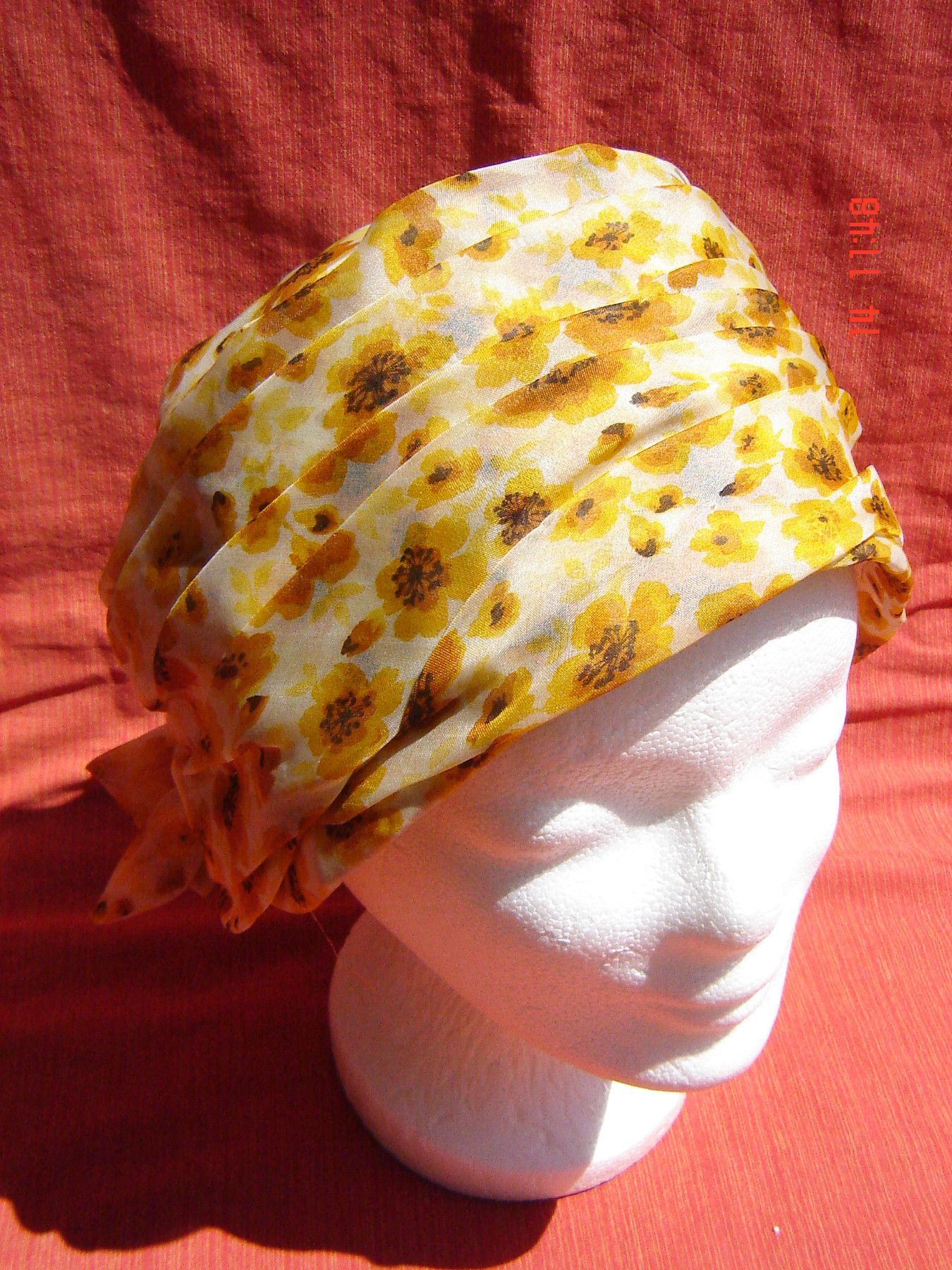 . Einzelstück nicht getragen , eigentlich neu löse einen Teil meiner Sammlung auf, aus einer Kollektion Fundus original aus der Zeit , wurde nur ausgestellt Kappe Turban aus den 80 90 er Jahren aus gelb geblümten Chiffon Stoff mit Innen Futter leicht ausgezeichnete Qualität , in Farbe gelb geblümt p