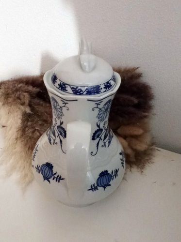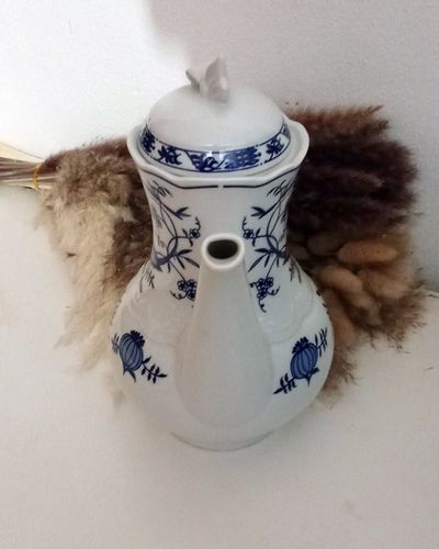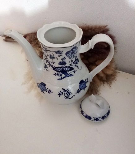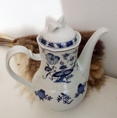 Zum Verkauf steht eine hochwertige Kaffeekanne aus Porzellan der traditionsreichen Marke KAHLA, hergestellt in der DDR. Die Kanne besticht durch ihr klassisches blaues Blumen- Zwiebelmuster-Dekor auf weißem Grund und ist ein schönes Beispiel für formschönes DDR-Design. Die Kaffeekanne ist original u