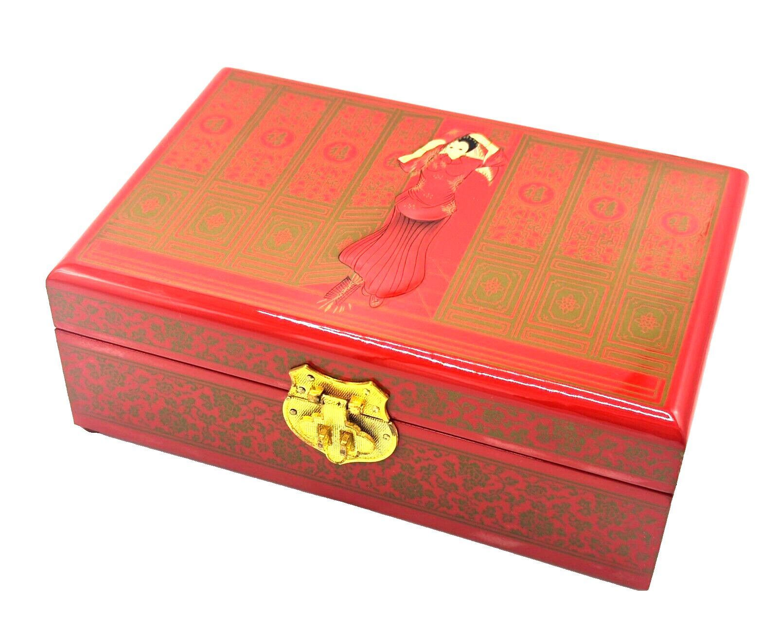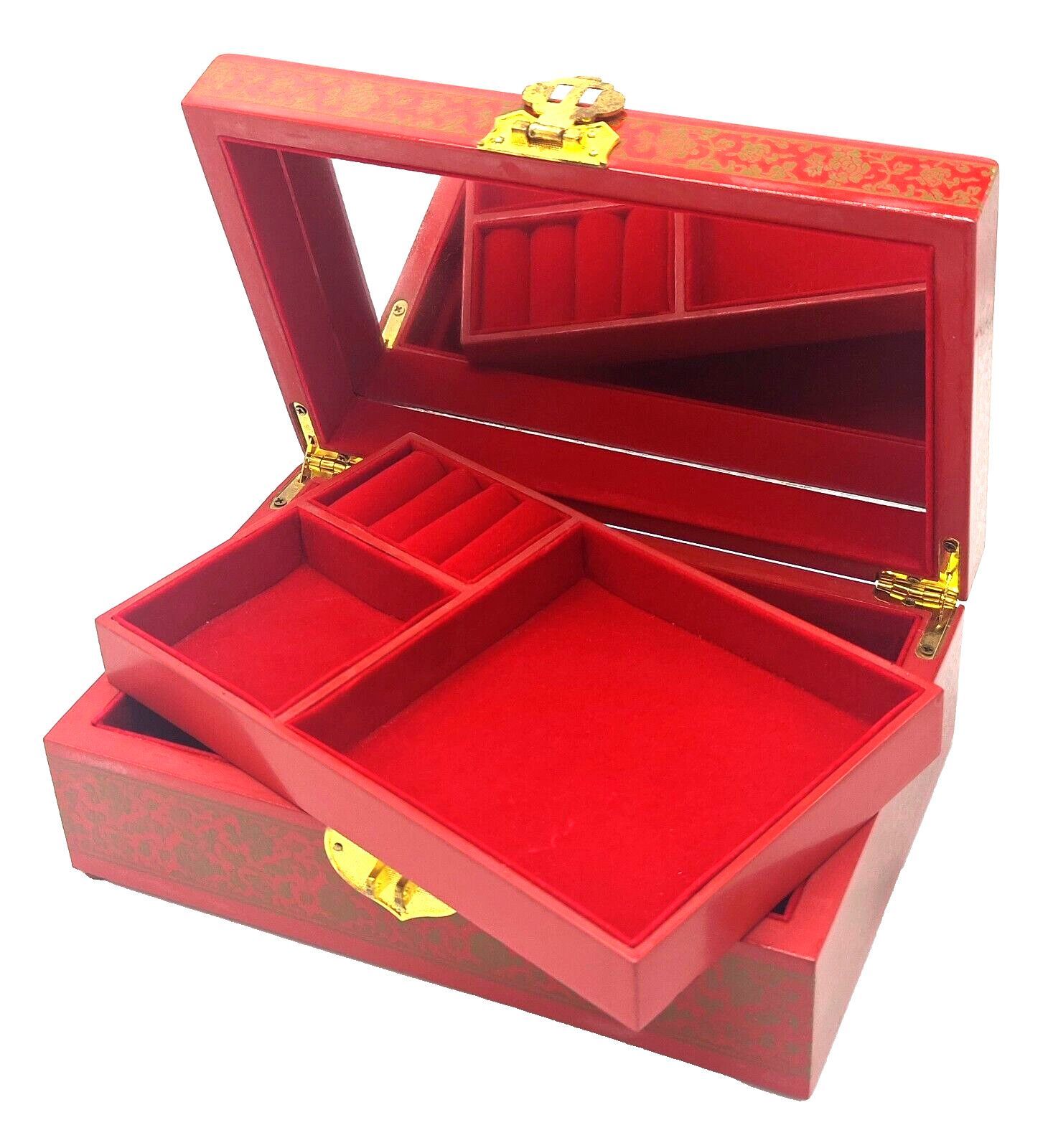 Die Vintage-Schmuckschatulle besteht aus hochwertigem Holz und ist mit rotem Flanell ausgeschlagen. Das Dekor ist handgemalt und mit mehreren Lackschichten versehen. Die Schmuckschatulle ist in einem antiken, ostasiatischen Design gestaltet. Diese Schmuckschatulle hat eine große Kapazität und eignet