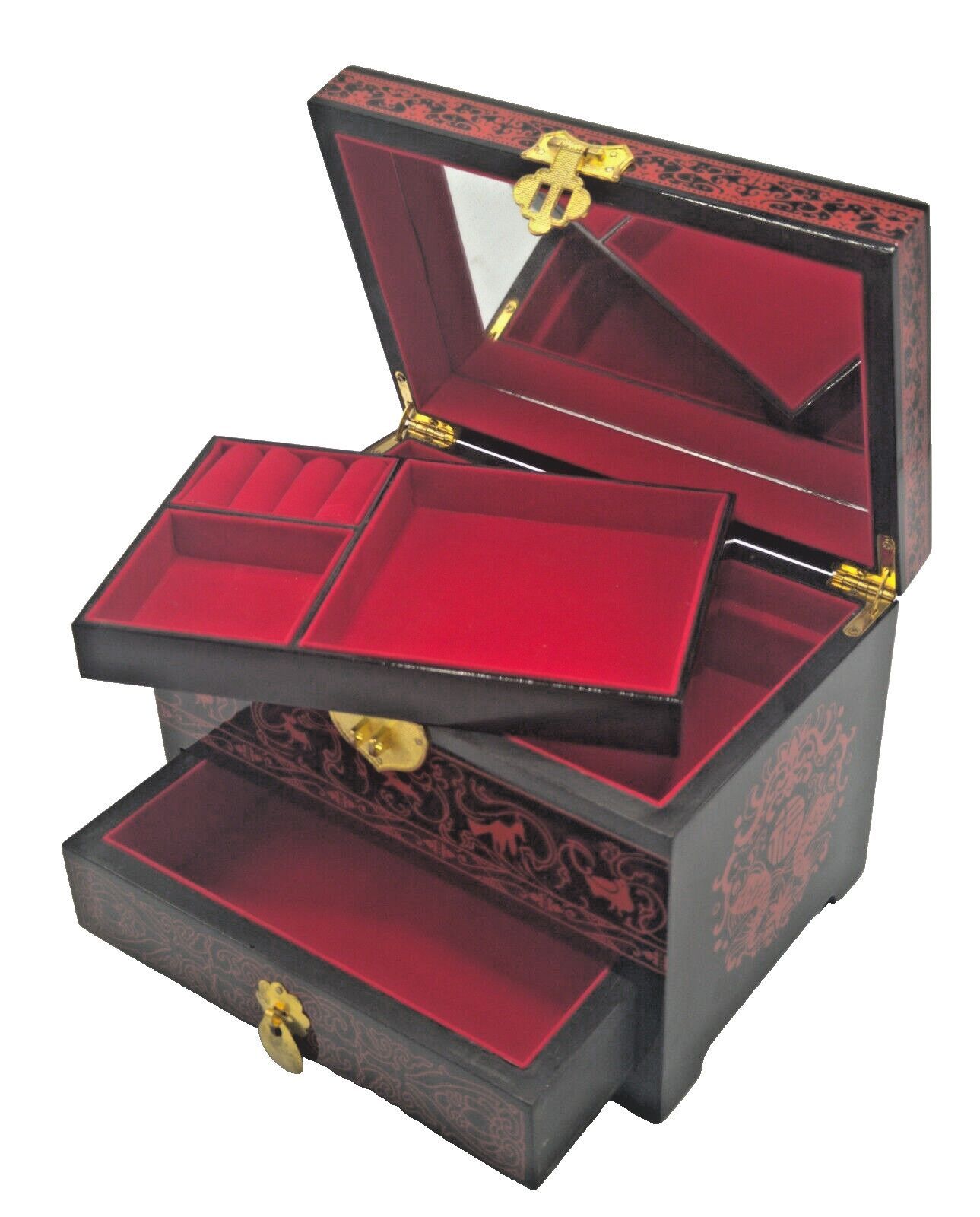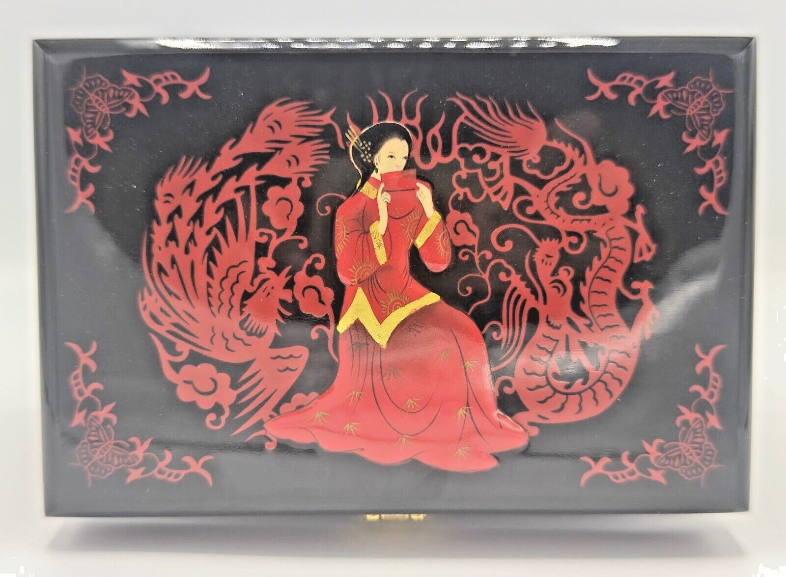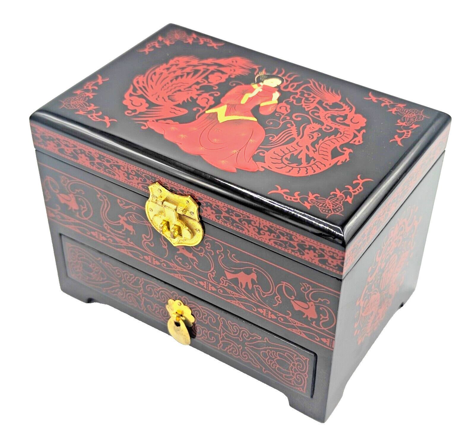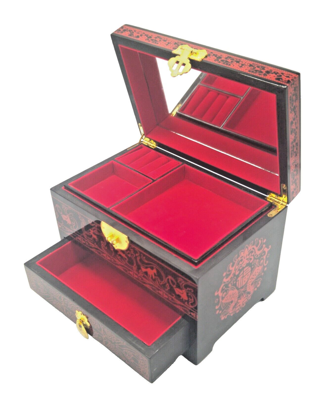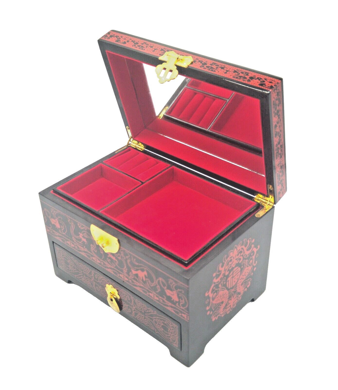 Die Vintage-Schmuckschatulle besteht aus hochwertigem Holz und ist mit rotem Flanell ausgeschlagen. Das Dekor ist handgemalt und mit mehreren Lackschichten versehen. Die Schmuckschatulle ist in einem antiken, ostasiatischen Design gestaltet. Diese Schmuckschatulle hat eine große Kapazität und eignet